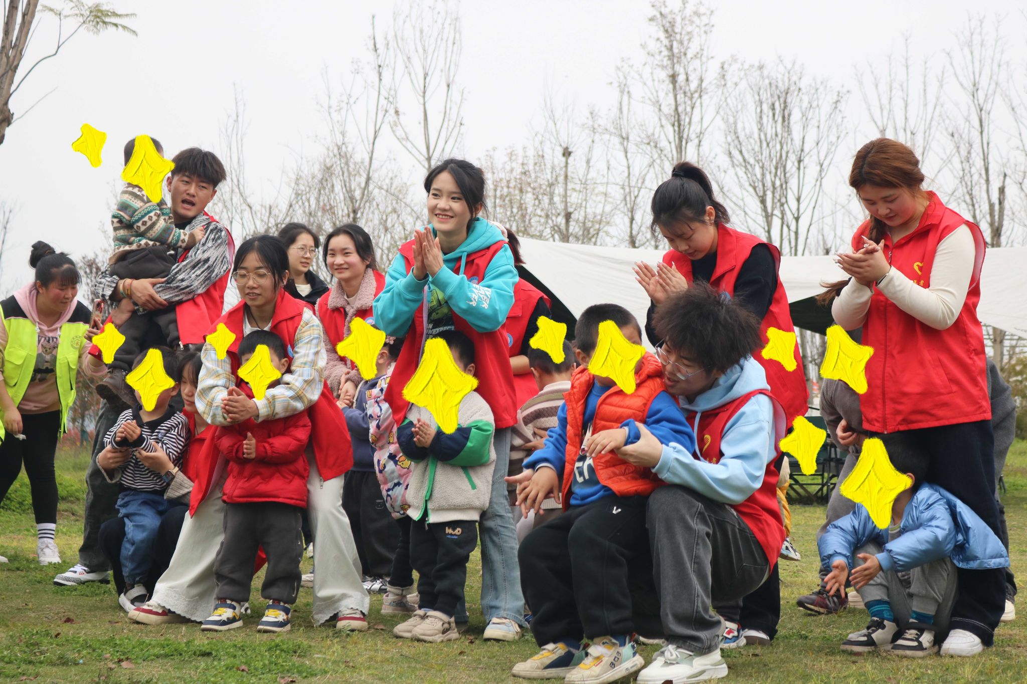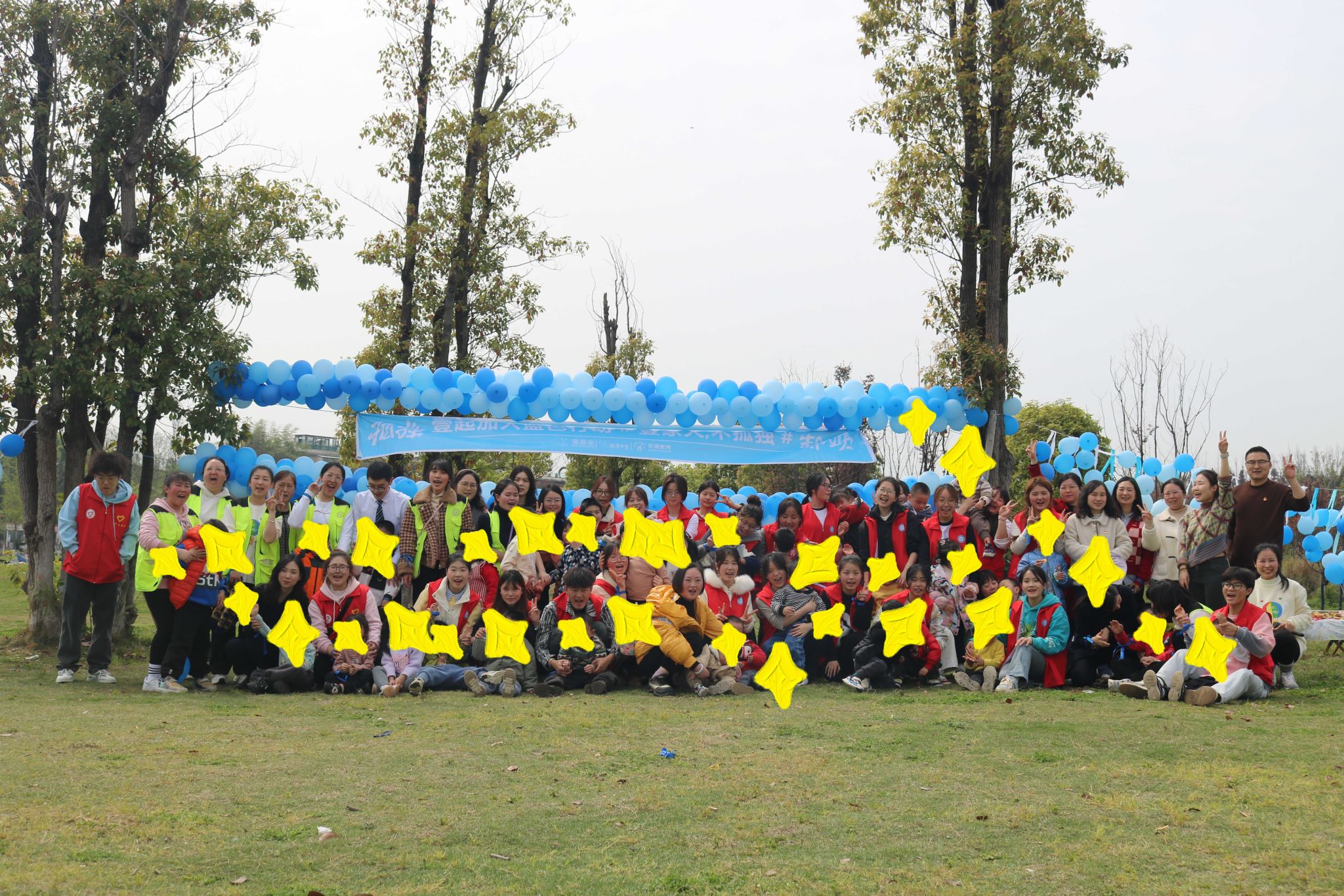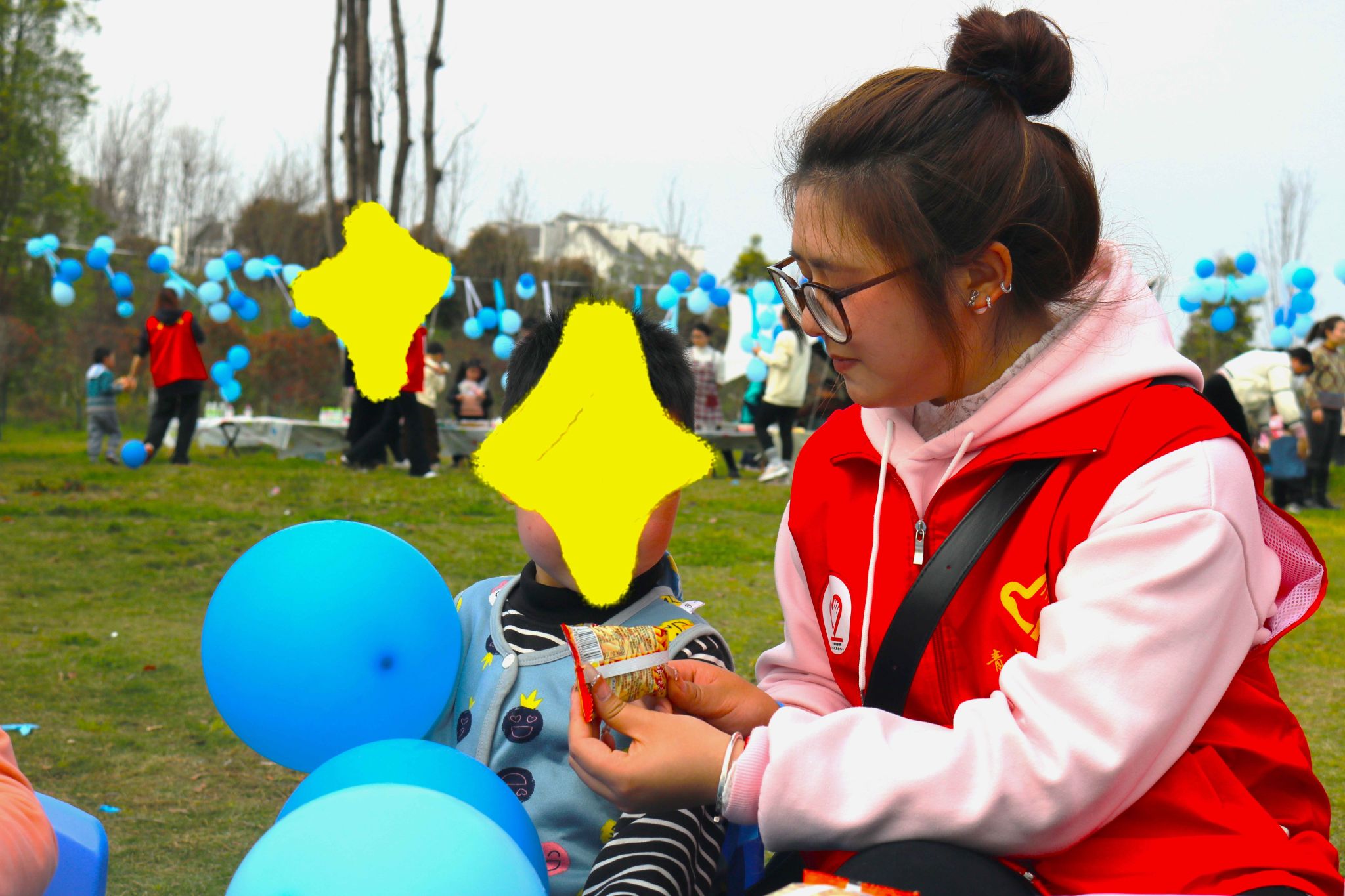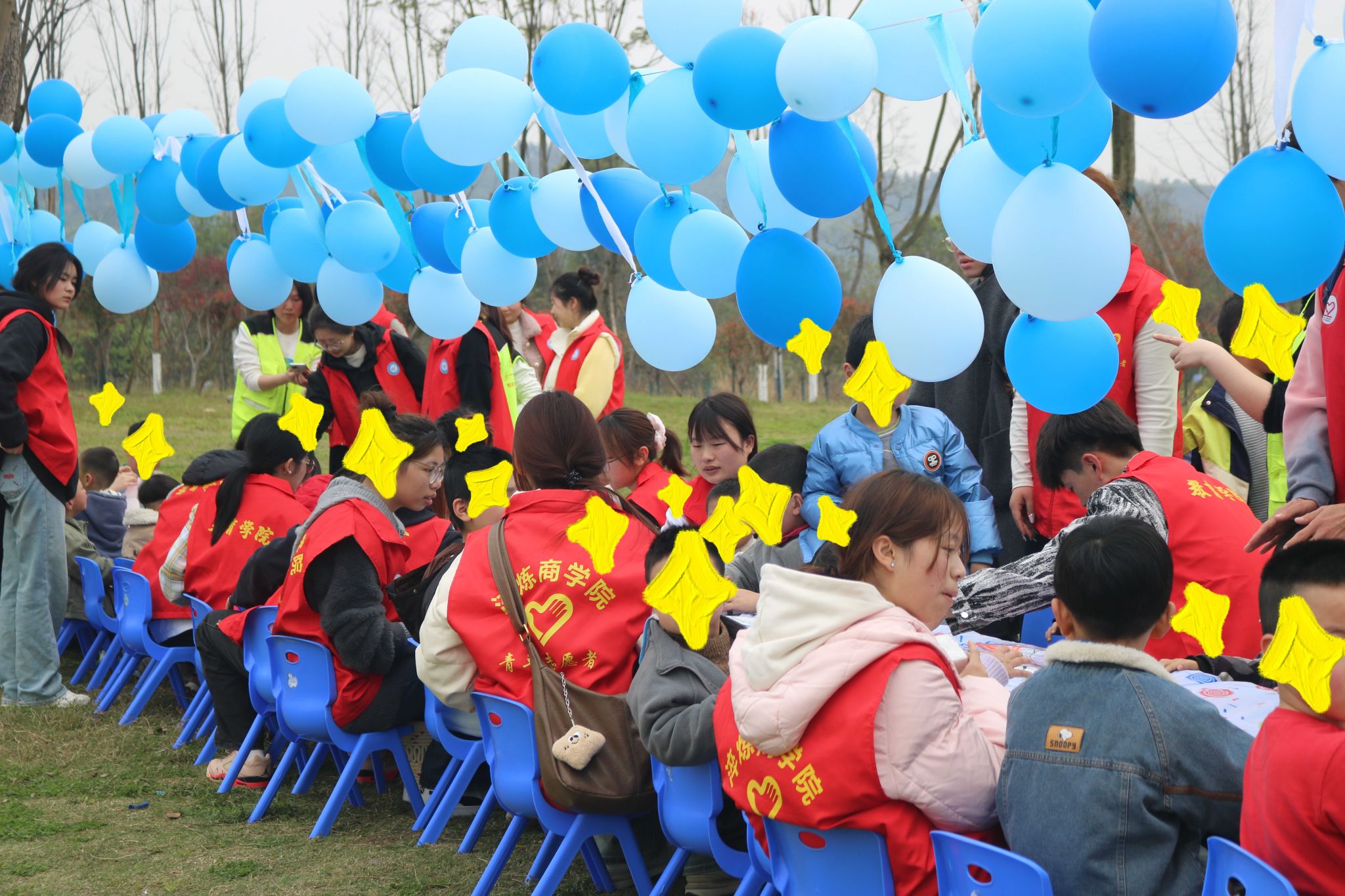 草坪化作创意宇宙,志愿者与孩子结成“星际拍档”。老师和志愿者们以一个成人和1-2名小朋友的形式进行一对一互动。草坪上飘扬的蓝色气球、身着红绿马甲的志愿者们,与老师们和小朋友们共同构成了一幅清新的清明踏青图。通过绘画、趣味小游戏及生活技能训练等环节,志愿者和小朋友们从最初的陌生逐渐变得熟络。