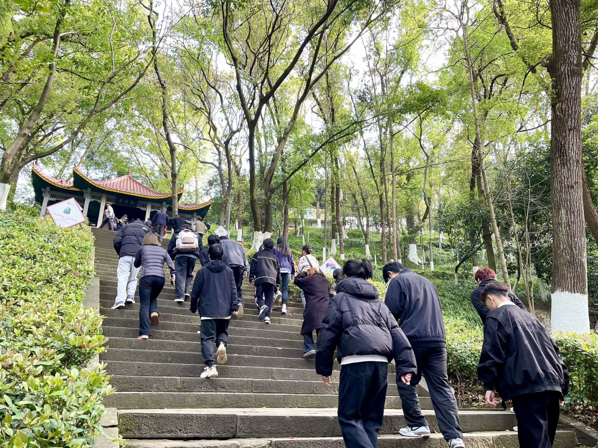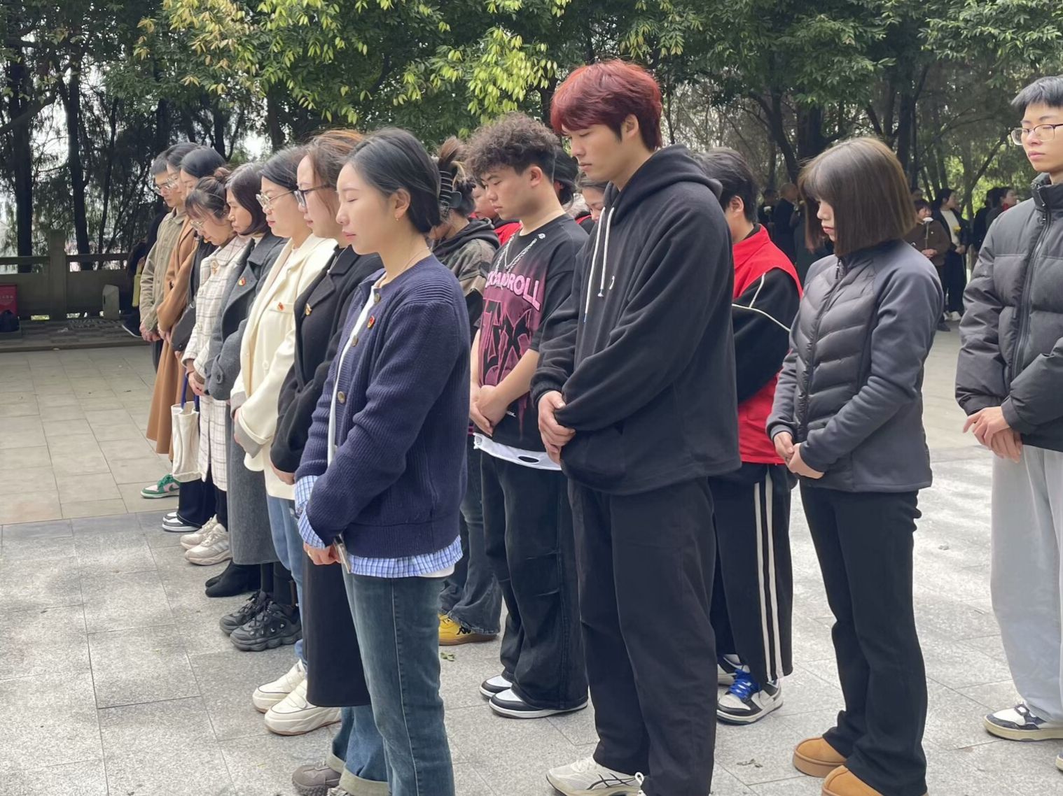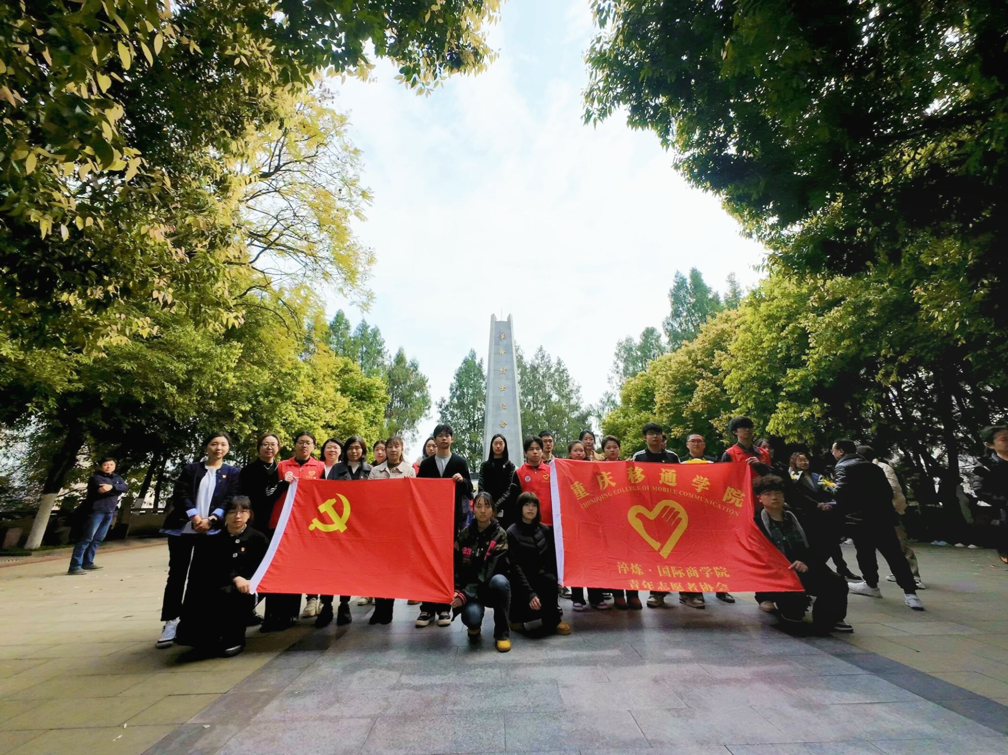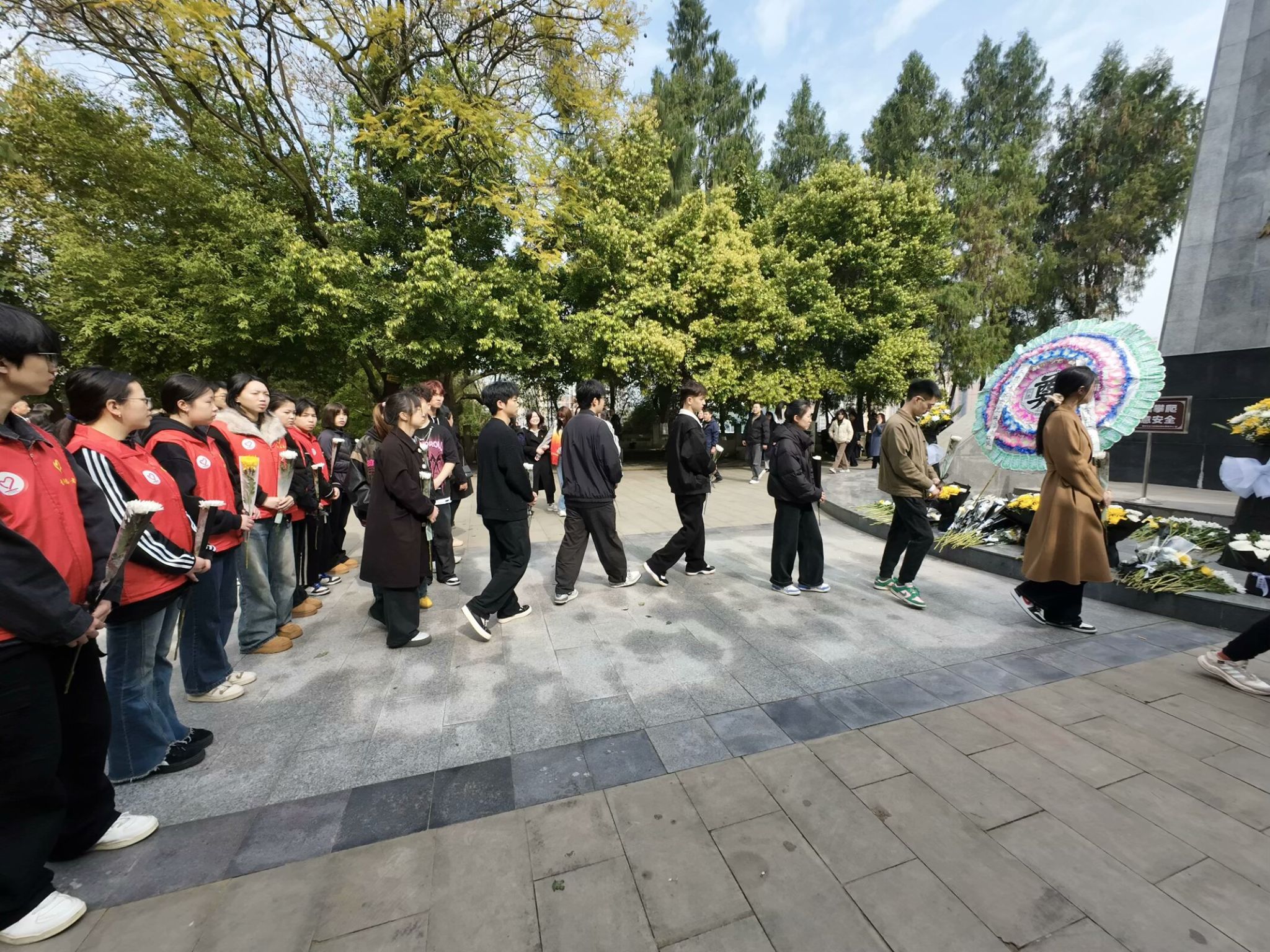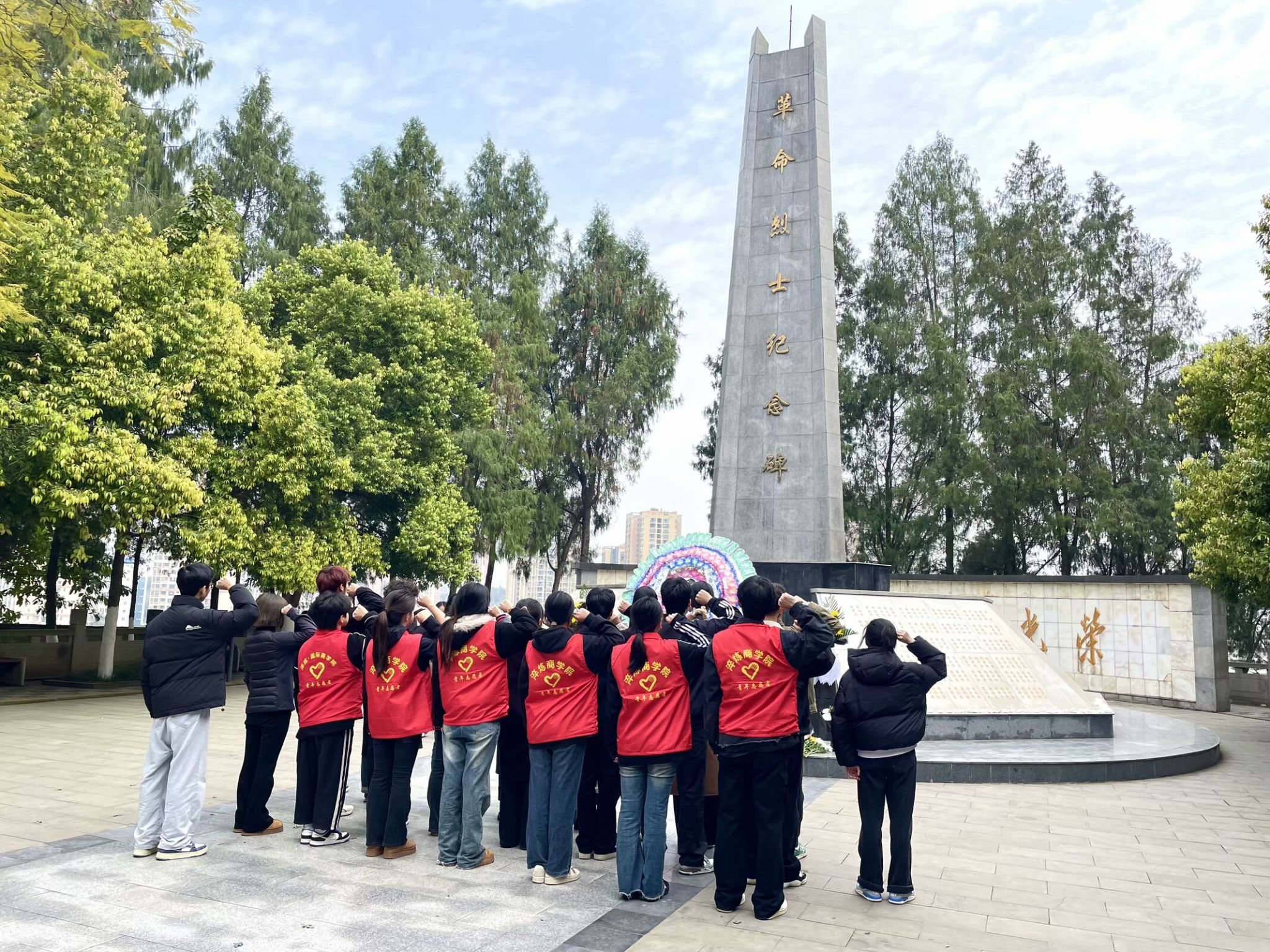 艳阳高照,松柏成荫。合川区人民公园内,淬炼商学院师生沿青松小路拾阶而上,松针簌簌落满衣襟。英雄纪念碑在阳光中巍然矗立,汉白玉浮雕上的英烈群像与师生们胸前的党徽交相辉映。两侧苍劲的松柏如持戟卫士,在春风中沙沙低语。每登一级台阶,鞋底与石阶的轻叩都仿佛历史的回响,让心中的崇敬如潮水般层层漫涌。中国红绸带在纪念碑基座猎猎飘扬,宛如先烈们永不褪色的赤诚。
