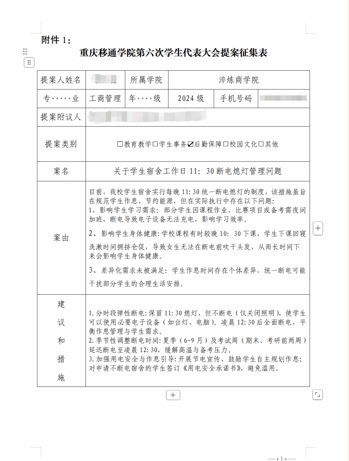 学校施行工作日11:30断电制度,旨在规范学生作息、响应号召节约能源但是存在一些问题。例如:部分同学的课程持续到22:30下课,学生下课回寝室洗漱时间仓促,部分同学来不及在断电前吹干头发。部分学生为备考、比赛项目需要夜间加班,断电导致其效率受影响。同时学生们的作息有一定的差异化。学生想提倡季节性调整断电措施,使得同学们既能缓解高温或者寒冷的条件下也能缓解学业压力。