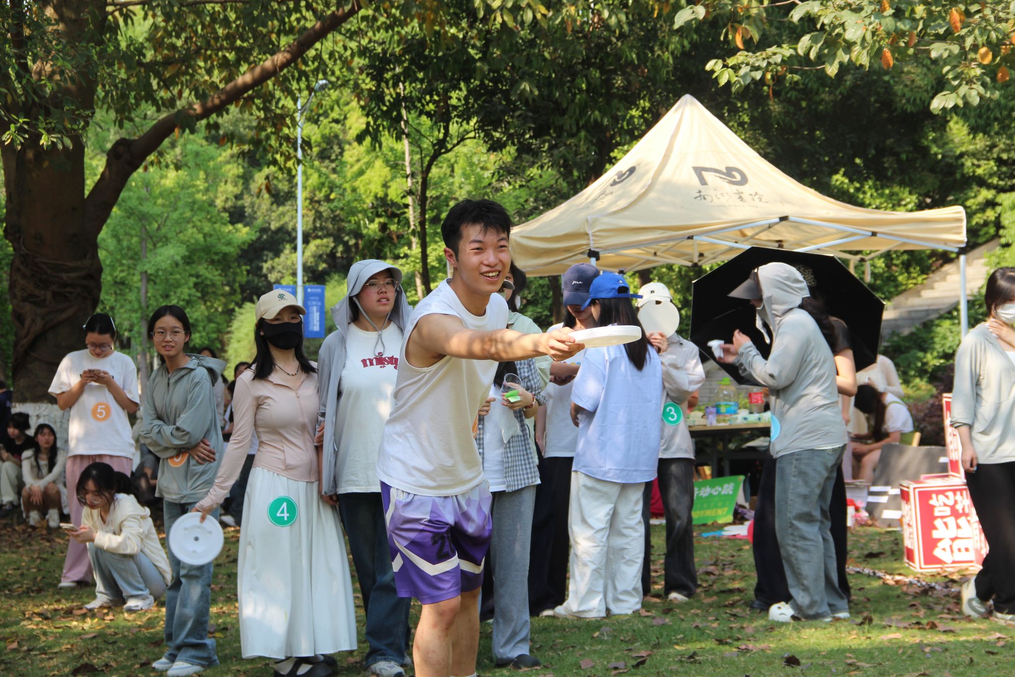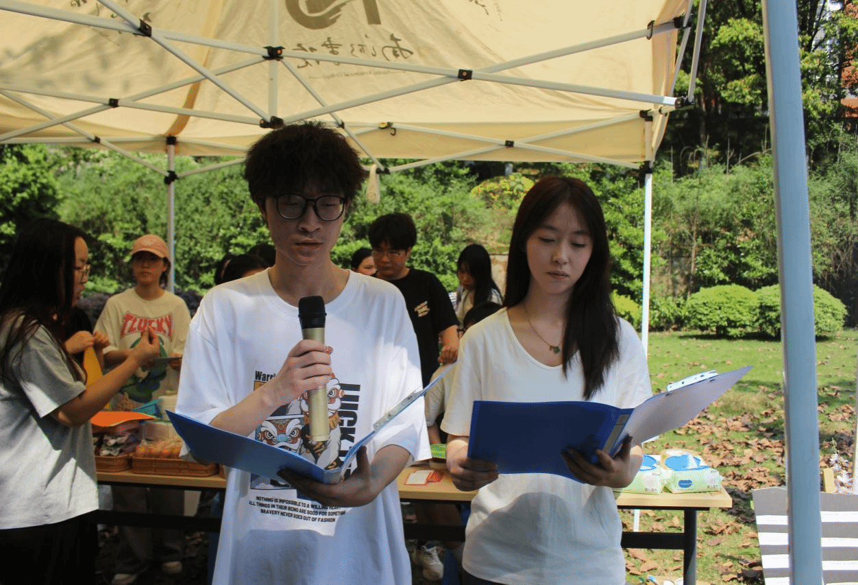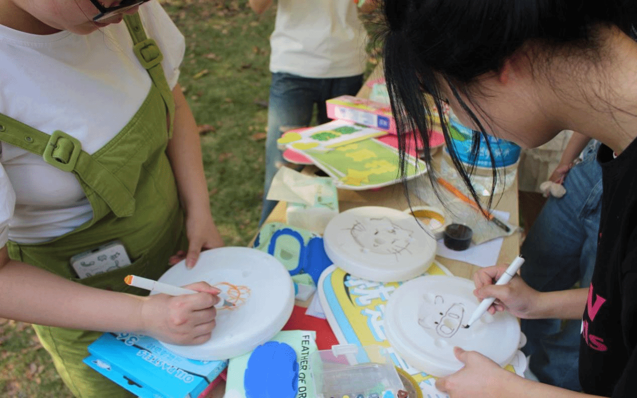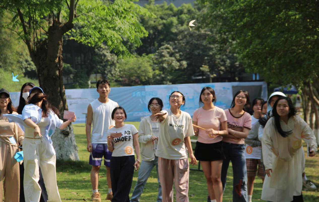 阳光在桌面流淌,裁纸刀划过卡纸的蟋蟀声与彩笔落纸的沙沙声交织成趣,同学们正在活动现场中进行飞盘和纸飞机制作比拼。有人在飞盘上绘制星空和海浪的纹路,有人在纸飞机上写下励志的短句,此刻审美与创造的火花在悄然迸发,飞盘与纸飞机化作承载巧思的载体在阳光下熠熠生辉。制作完成后,在主持人的带领下各小组展开了团队掷远比拼,现场热闹非凡,欢呼声与鼓掌声是同学们青春洋溢的体现。