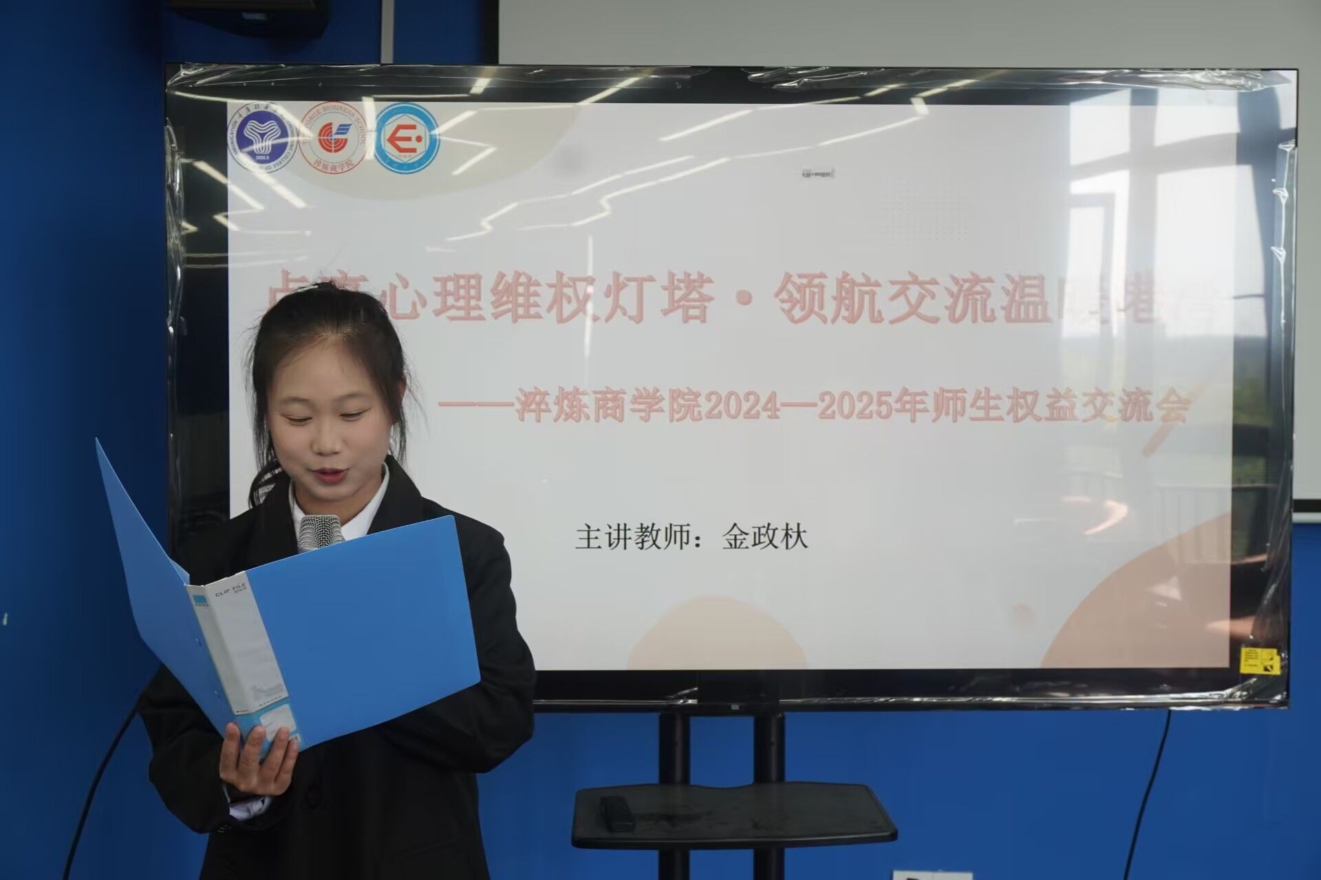 本次活动金政杕老师通过心理知识的讲解和答疑互动,不仅展现了对学生全面发展的关注,也为师生搭建了一个交流互动的平台,为学生提供了心理支持和权益保障,让同学们学到更多心理健康的知识。在心理健康之旅中,淬炼儿们如同航行在广阔的心海,努力寻找着内心的平静与和谐。愿这些心灵的航标和情绪的灯塔,能够指引商院学子们穿越波涛,抵达宁静的彼岸。让我们共同关注心理健康,拥抱每一个情绪的起伏,让心灵之光永远照亮前行的道路。