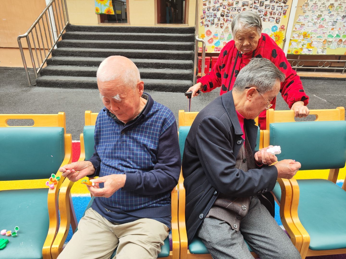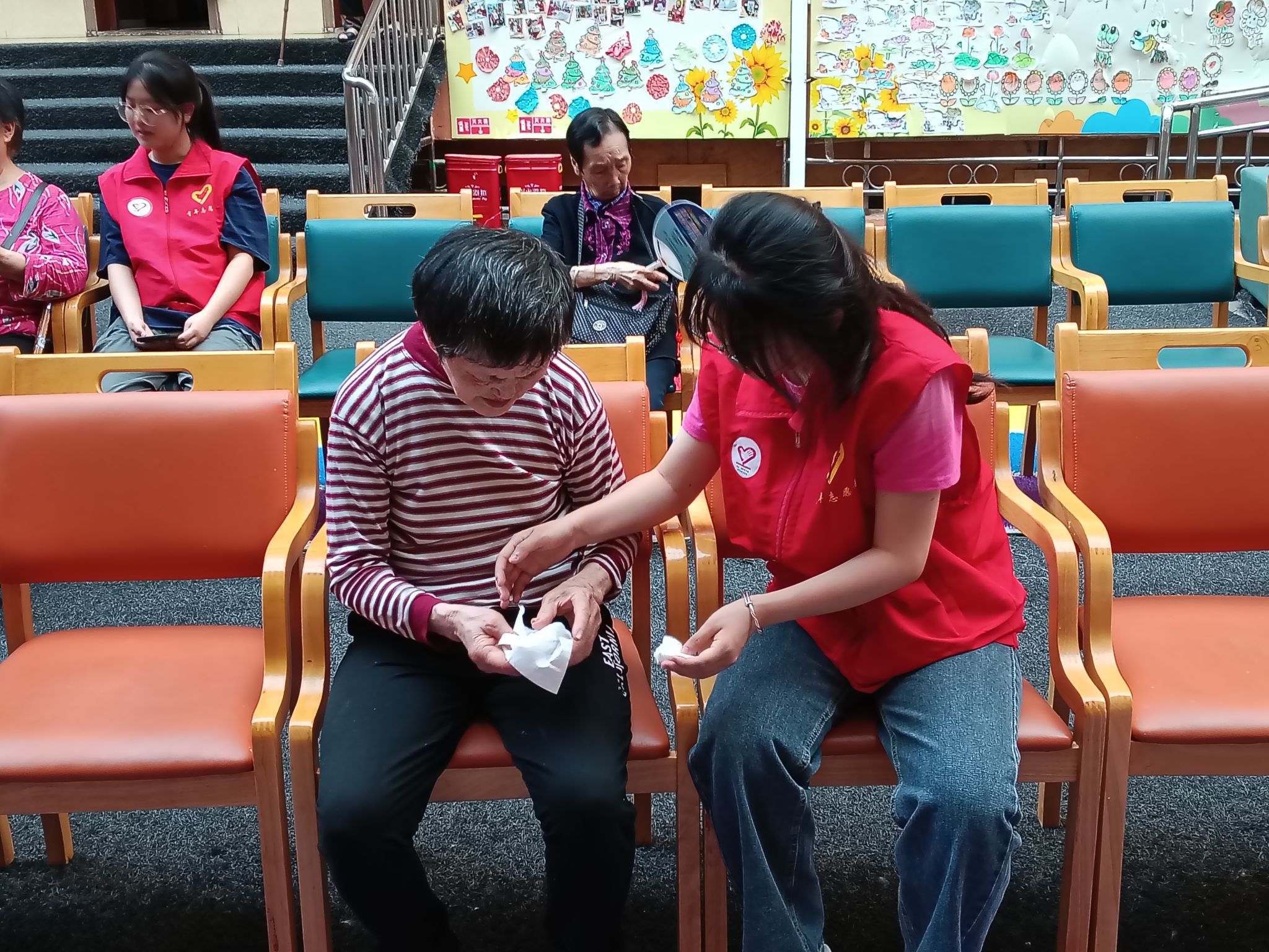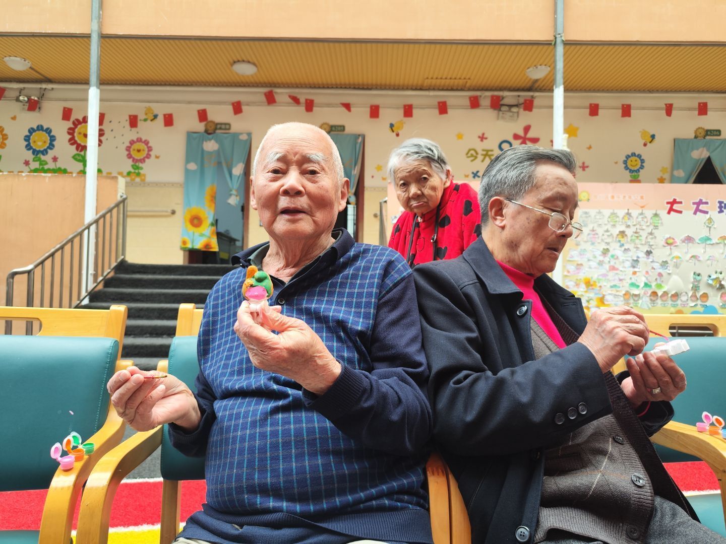 在关怀陪伴的间隙,志愿者们拿出精心准备的小礼物——洁白的石膏娃娃。这些等待上色的石膏娃娃,成为了老人们与志愿者互动的纽带。志愿者们半蹲在老人身旁,小心翼翼地牵起那双布满岁月纹路的手,将蘸满缤纷颜料的画笔轻轻放入老人掌心。粗糙却温暖的大手,与年轻柔软的小手紧紧相握,两代人共同执起画笔,在石膏娃娃上缓缓勾勒。蘸着颜料的笔尖在石膏表面游走,红色绘出热情,蓝色晕染宁静,黄色点亮希望。原本素净的娃娃,在交织的笔触下,渐渐绽放出绚丽色彩,仿佛被注入了鲜活的生命力。