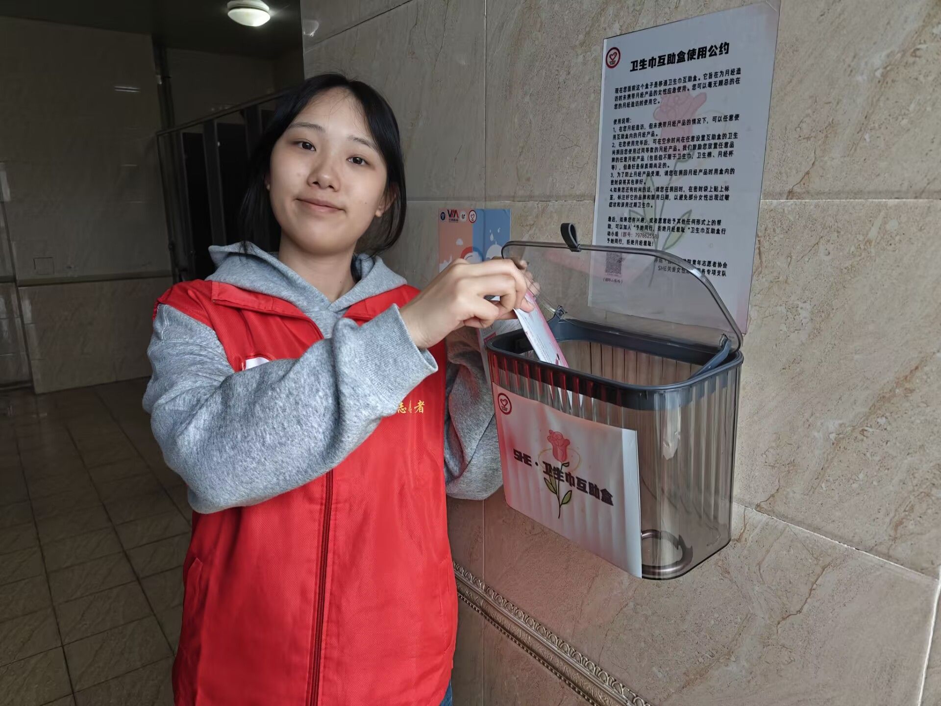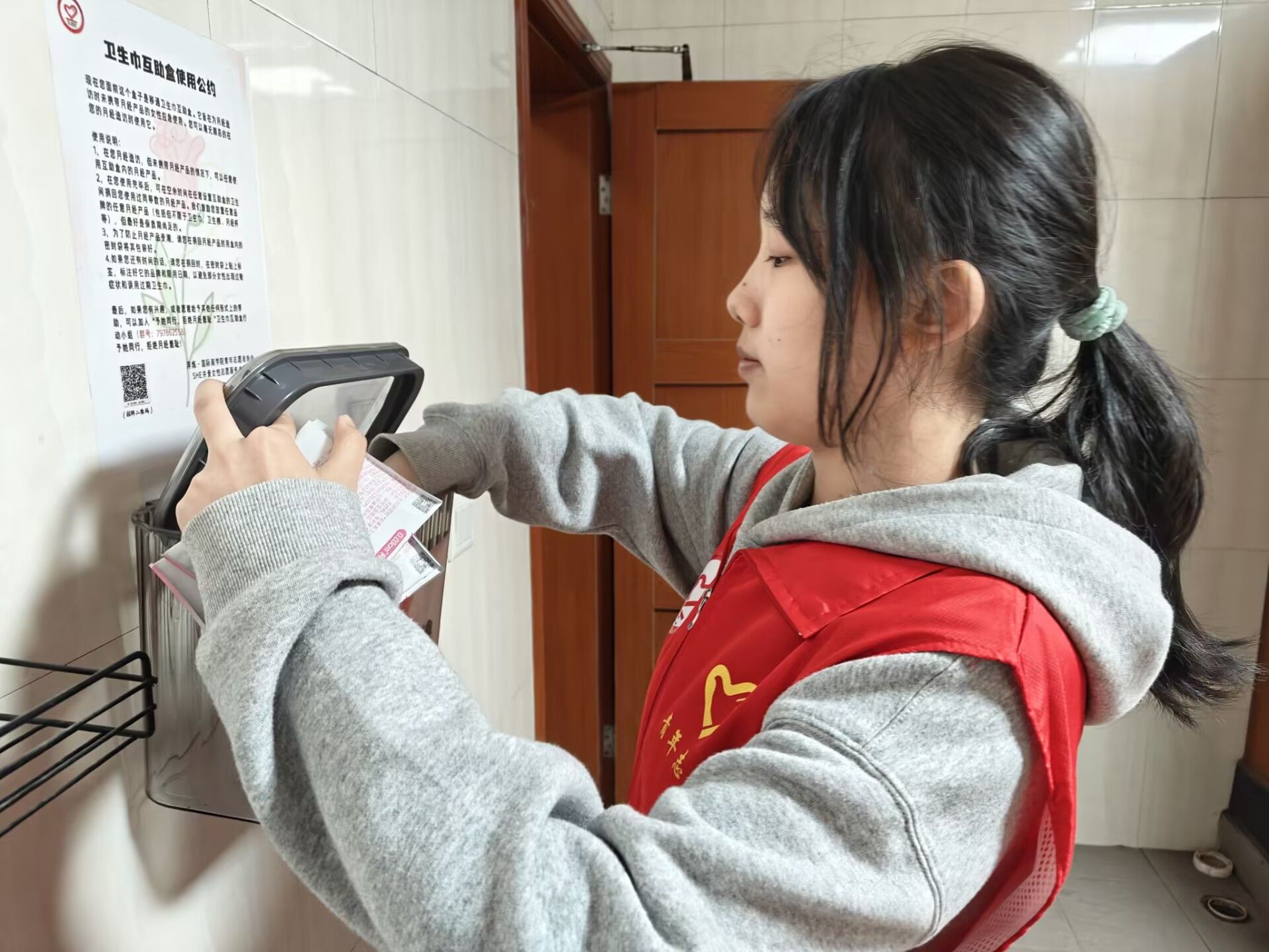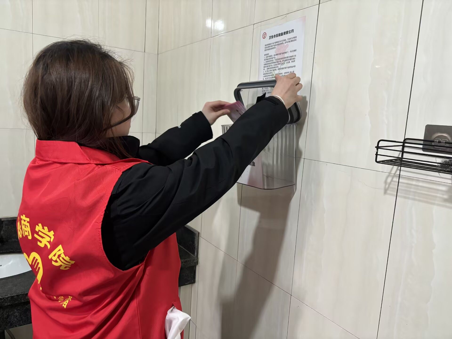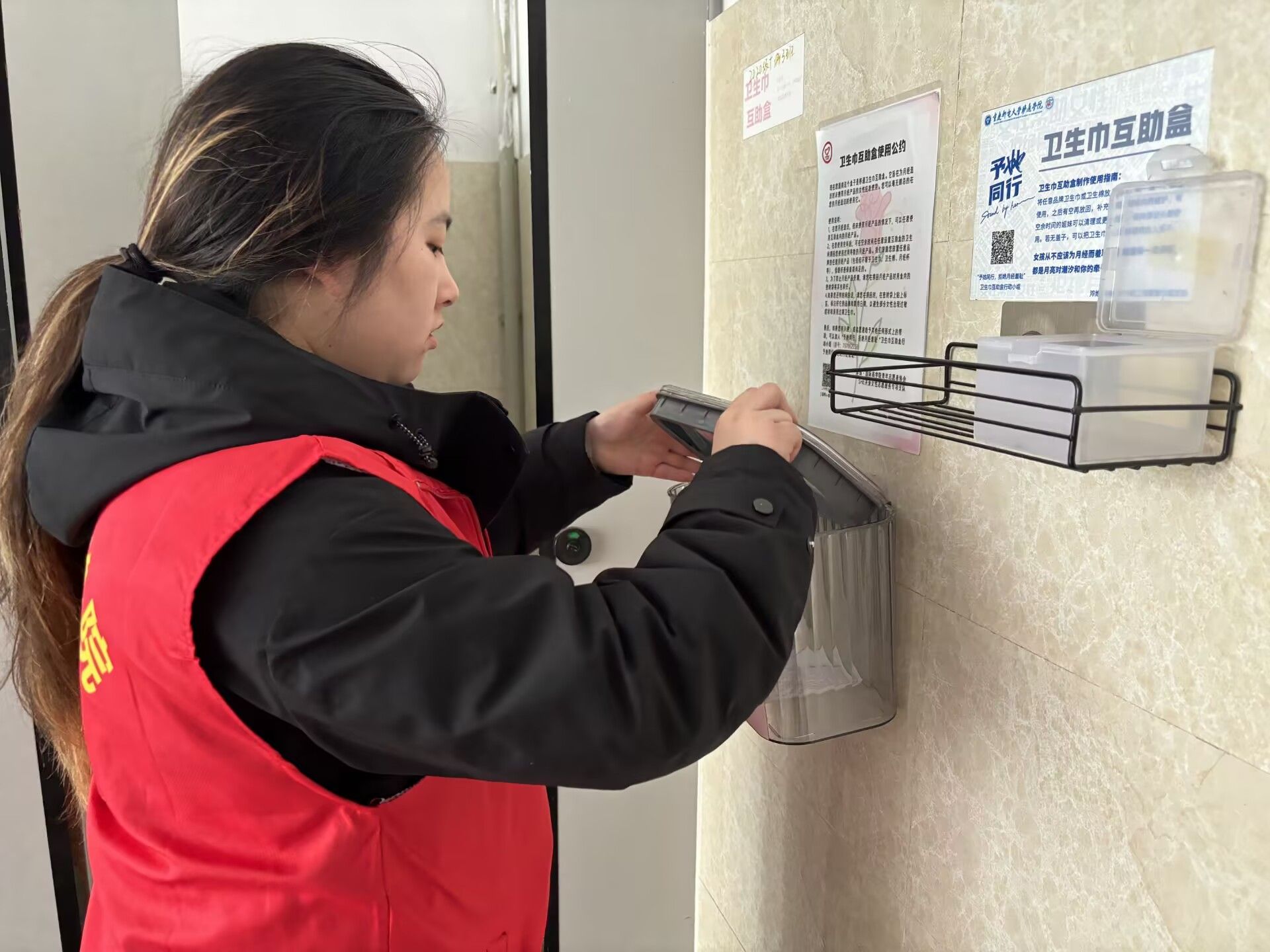 志愿者们趁着中午休息的间隙,怀揣着爱心包裹,脚步匆匆却又小心翼翼地穿梭于校园女厕之间。志愿者们将一包包装载着温暖的卫生巾,轻柔地摆放在各个隔间精心设置的取用区,摆放的动作满是庄重与认真,仿佛在完成一场神圣的仪式。每一个取用点,都是他们传递关爱的驿站。