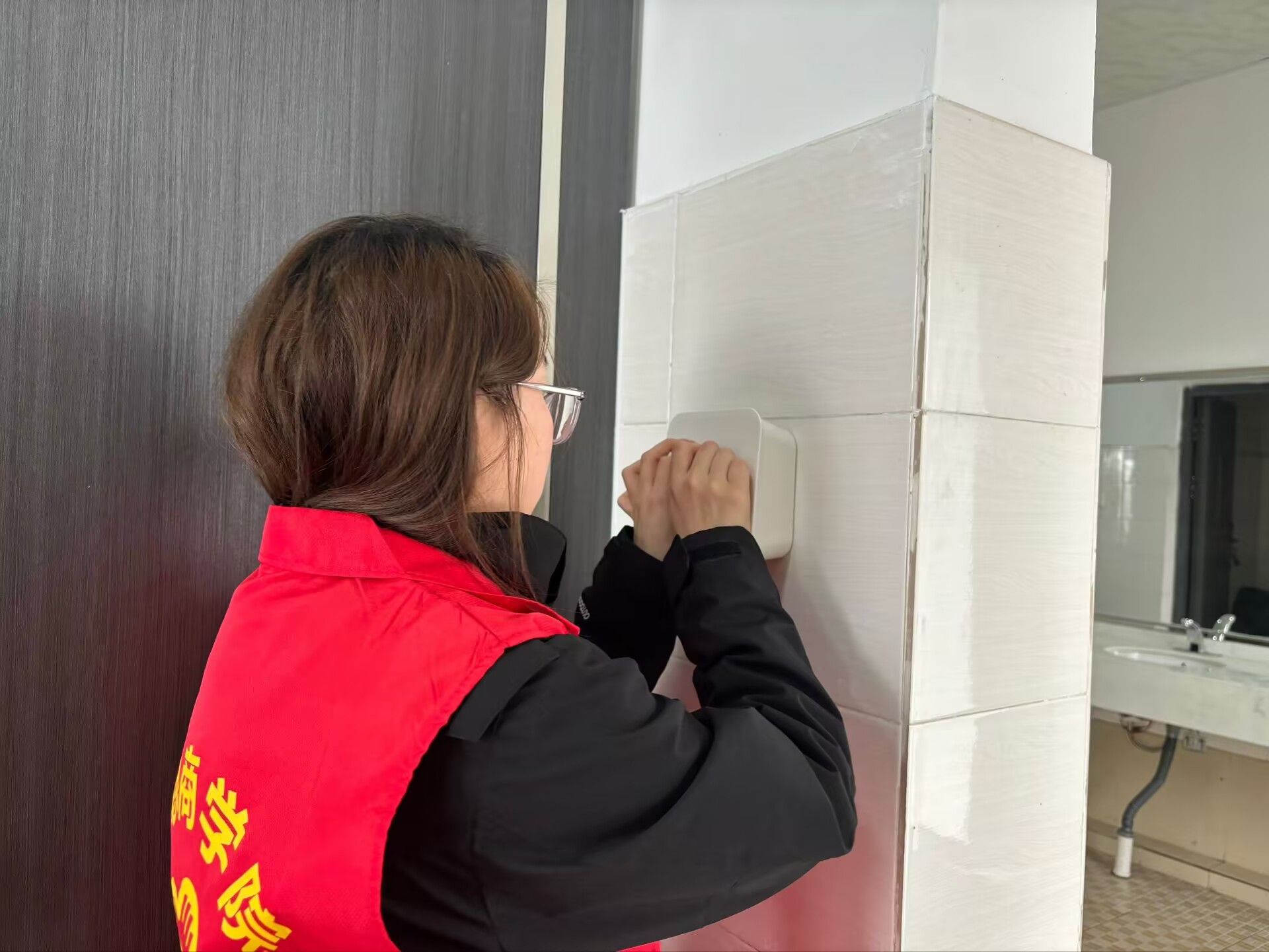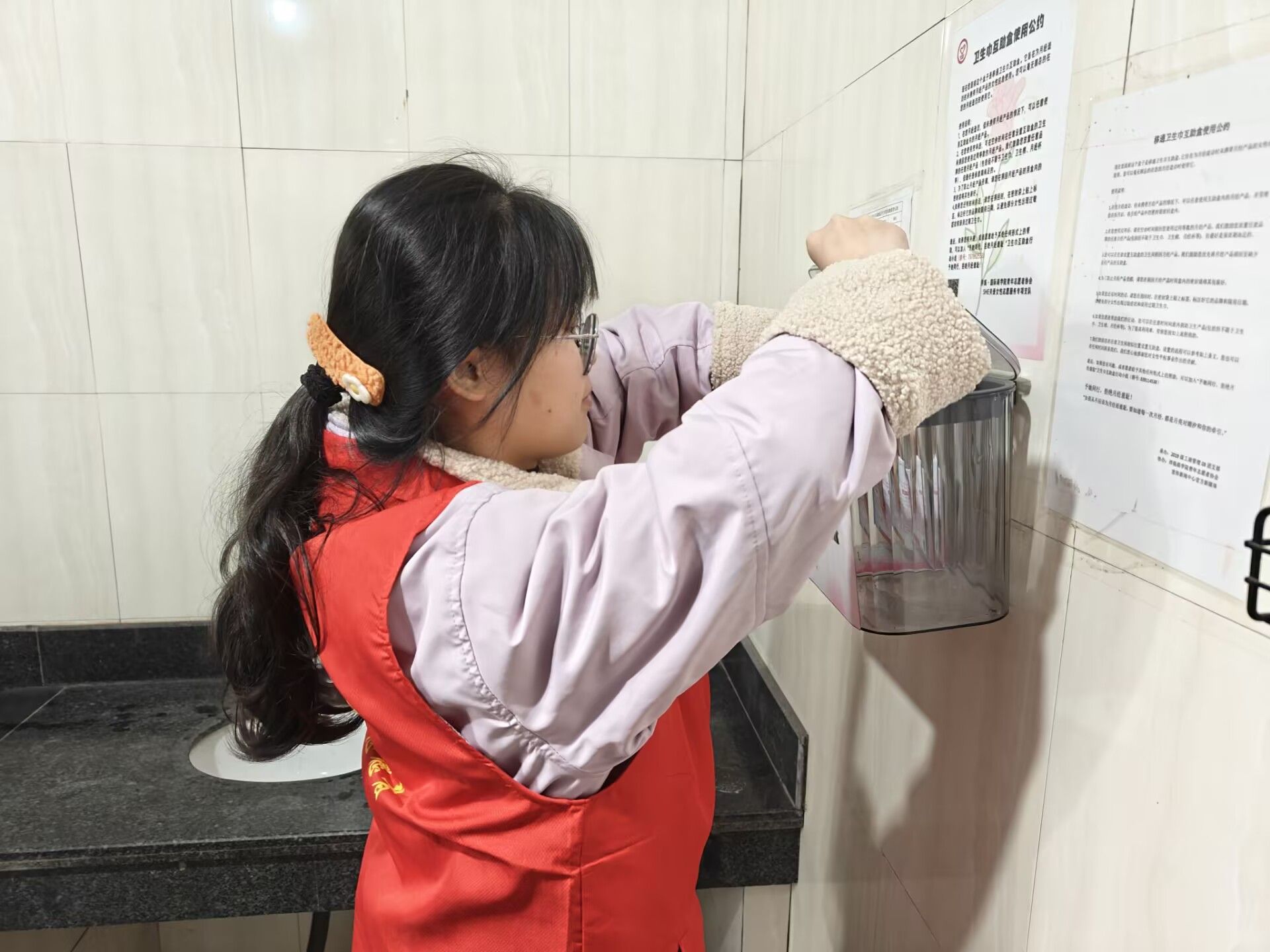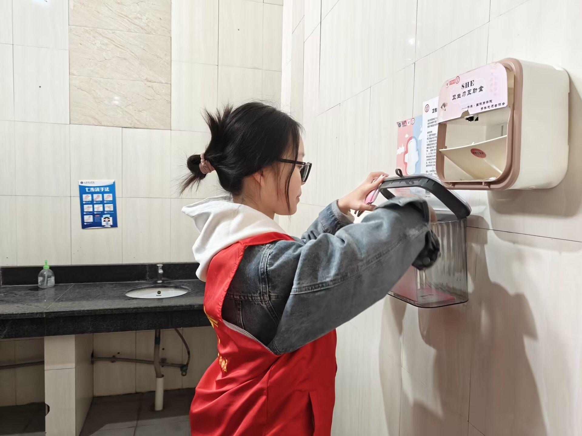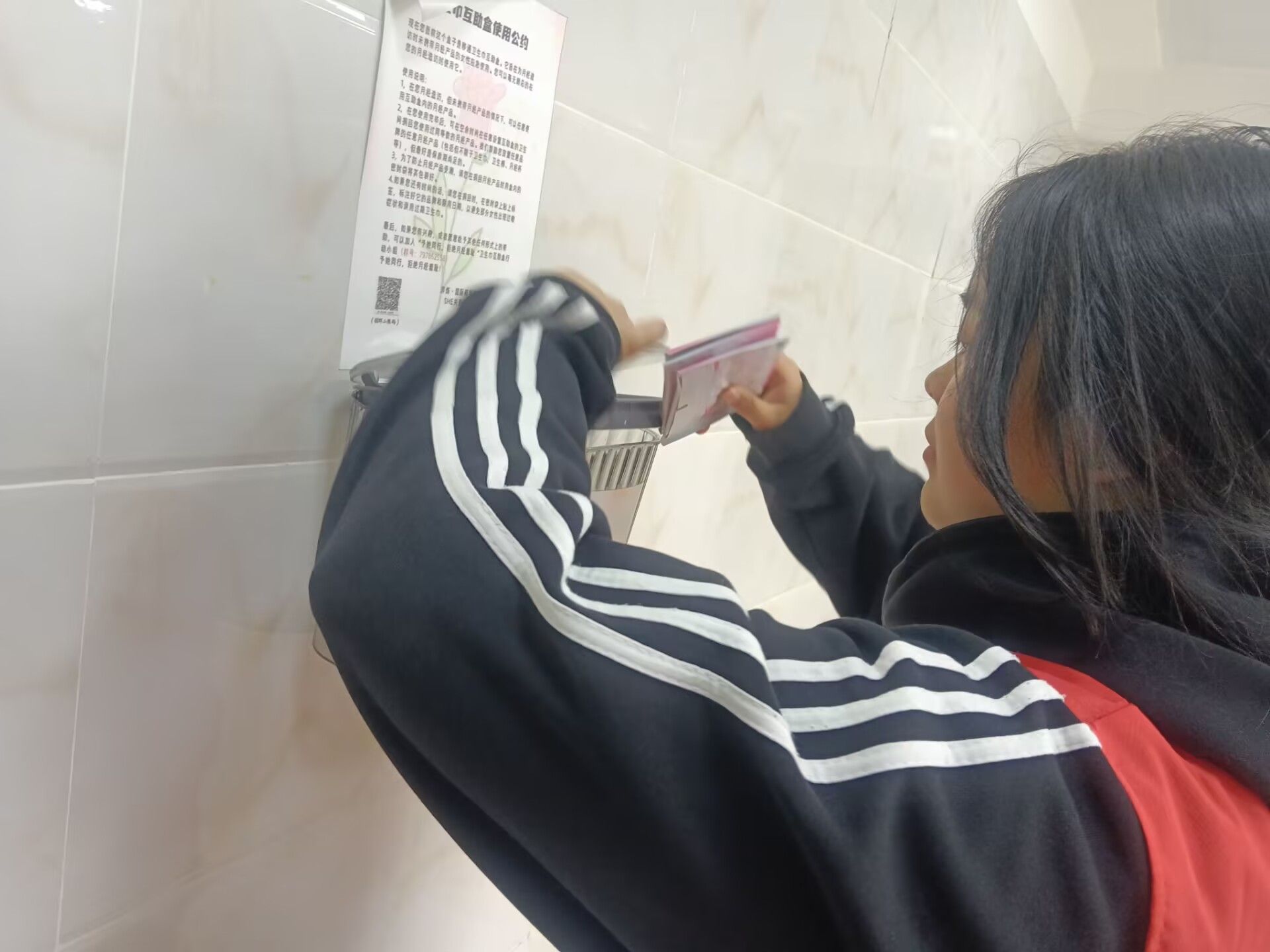 志愿者们趁着中午休息的间隙,怀揣着爱心包裹,脚步匆匆却又小心翼翼地穿梭于校园女厕之间。志愿者们将一包包装载着温暖的卫生巾,轻柔地摆放在各个隔间精心设置的取用区,摆放的动作满是庄重与认真,仿佛在完成一场神圣的仪式。每一个取用点,都是他们传递关爱的驿站。