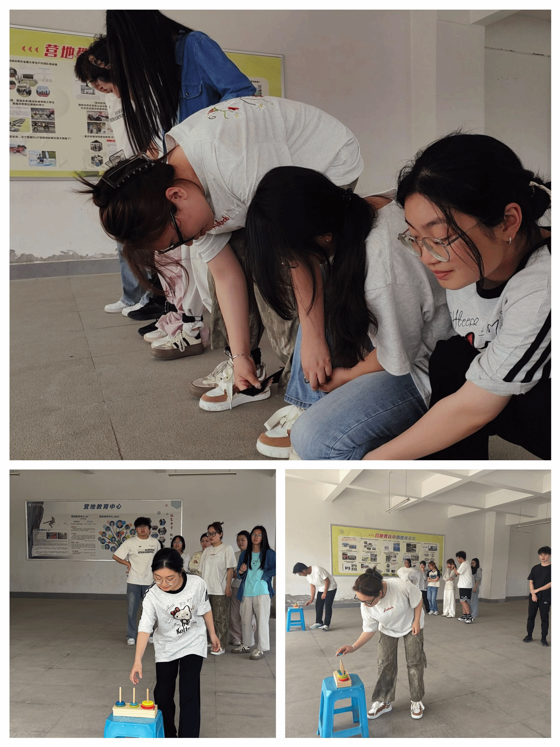 第二环节由两个汉诺塔展开,汉诺塔作为一款经典的益智游戏,考验着团队的策略规划与协作执行能力。在教官简单介绍过游戏规则后,两小组迅速进入思考状态,围成石榴一般在一起讨论策划。有人用树枝在地上比划着步骤,有人运用数学的专业知识,有人则不断观察并考量前行方案。本次比赛,双方兵刃不让,各自凭借智勇进行前期周密的规划,开局便稳扎稳打,小组内成员互相鼓励,互相出谋划策,使得游戏过程非常愉悦轻松。汉诺塔游戏对于大部分成员都较为陌生,初次接触,但在紧张的比赛过程中却无人泄气。小组形成移动链,以流水线作业缩短耗时。过程中虽然出现失误的情况。但依旧秉持着“千磨万击还坚劲,任尔东西南北风”的精神,反复攻克难题。在25分钟的激烈角逐后,终以“奔跑队”率先完成汉诺塔堆建而结束了这场比赛,铁锤队虽落后几秒钟,但对于他们而言比赛中收获到的快乐已远远超过获得比赛输赢的重要性。