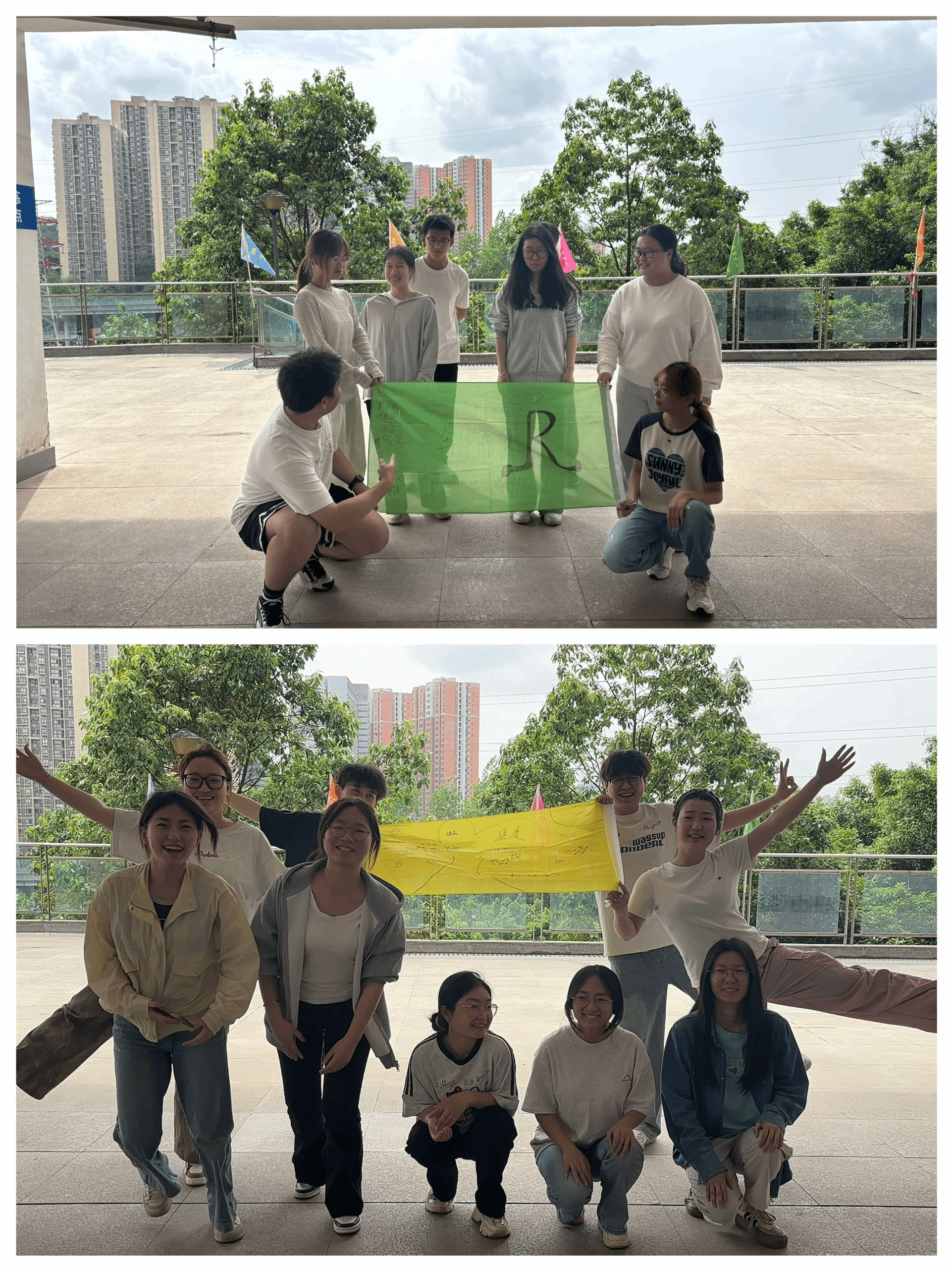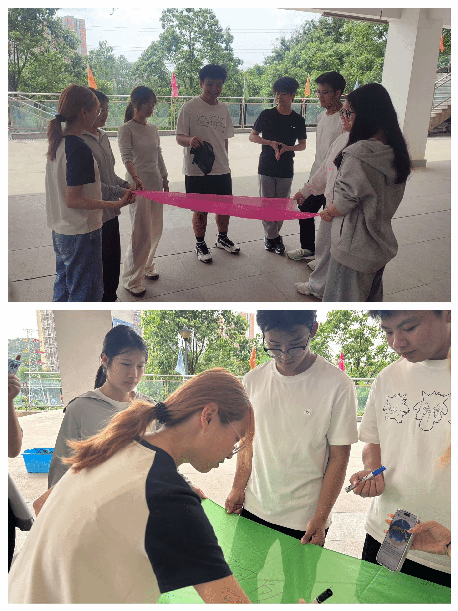 活动伊始,青马学员们以抽签分为两组。一声令下,两队即刻进入“战备状态”,队名设计、队旗绘制、队歌创作环环相扣,一场关于“凝聚力”的破冰之旅在欢笑与掌声中悄然拉开帷幕。第一小组取“奔跑”为名,寓青年当以“风驰电掣”之姿逐梦时代,以“不待扬鞭自奋蹄”之志攀登高峰。小组成员齐心绘制绿色为底,尽显小组成员追风逐电,志在凌霄的气迈。队长解读本组队旗与队名的含义为:“赛道是人生路,星芒是理想光,我们愿做追光者,亦做发光体。”奔跑队学员齐唱《奔跑》:“追逐雷和闪电的力量”……。第二组则化用“宝剑锋从磨砺出”,喻青年当以“铁肩担道义”之责,在时代熔炉中锻造“越是艰险越向前”的骨气。队旗以黄色为基,在旗帜上绘制一颗茁壮的青树,在每一根茎叶处签署上成员的姓名,不仅彰显了成员间的相互信任,更是显化了第二组肯千锤百炼,淬火成锋的决心。一曲《倔强》响彻全场,当“逆风的方向更适合飞翔”唱至高潮,队员们激情高歌,士气昂扬,使得观者无不热血沸腾。