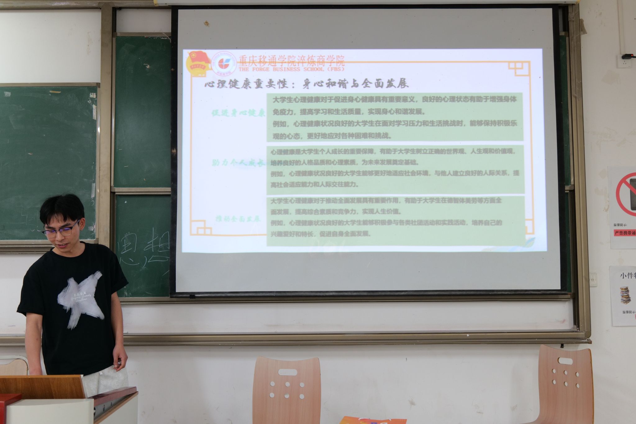 淬炼商学院团总支学生副书记罗亮强调心理健康对于大学生的重要性。心理健康不仅对促进身心健康具有重要意义,良好的心理状态有助于增强身体免疫力,提高学习和生活质量,实现身心和谐发展,是大学生个人成长的重要保障,有助于大学生树立正确的世界观、人生观、价值观,培养良好的人格品质和心理素质,为未来发展奠定基础。此外,心理健康对于推动全面发展具有重要作用,有助于学生骨干在德智体美劳等方面全面发展,提高综合素质和竞争力,实现人生价值。