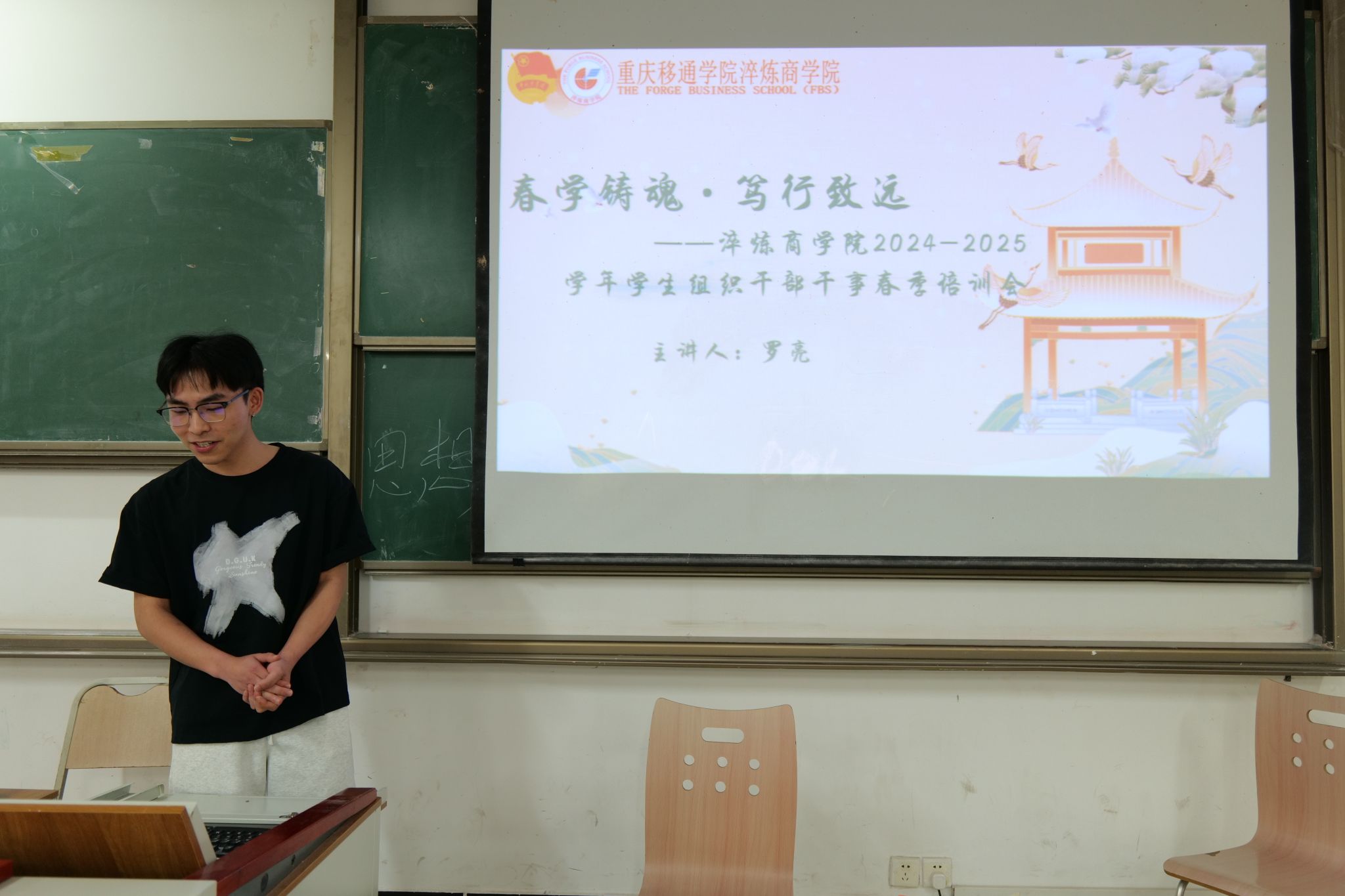 为深入领会习近平总书记重要指示精神,增强政治意识与使命感、学习防范化解团学舆情风险,提升应对舆情的能力,维护校园稳定。同时,聚焦大学生心理健康,关注学生心理状态,助力其健康成长,全面推动校园和谐发展。淬炼商学院学生会于2025年5月11日下午6:00在第五教学楼5101开展了“春学铸魂·笃行致远”——淬炼商学院2024-2025学年学生组织干部干事春季培训会。通过本次培训进一步提升商院学子的心理素养和思想觉悟,为学习和生活打下坚实基础。