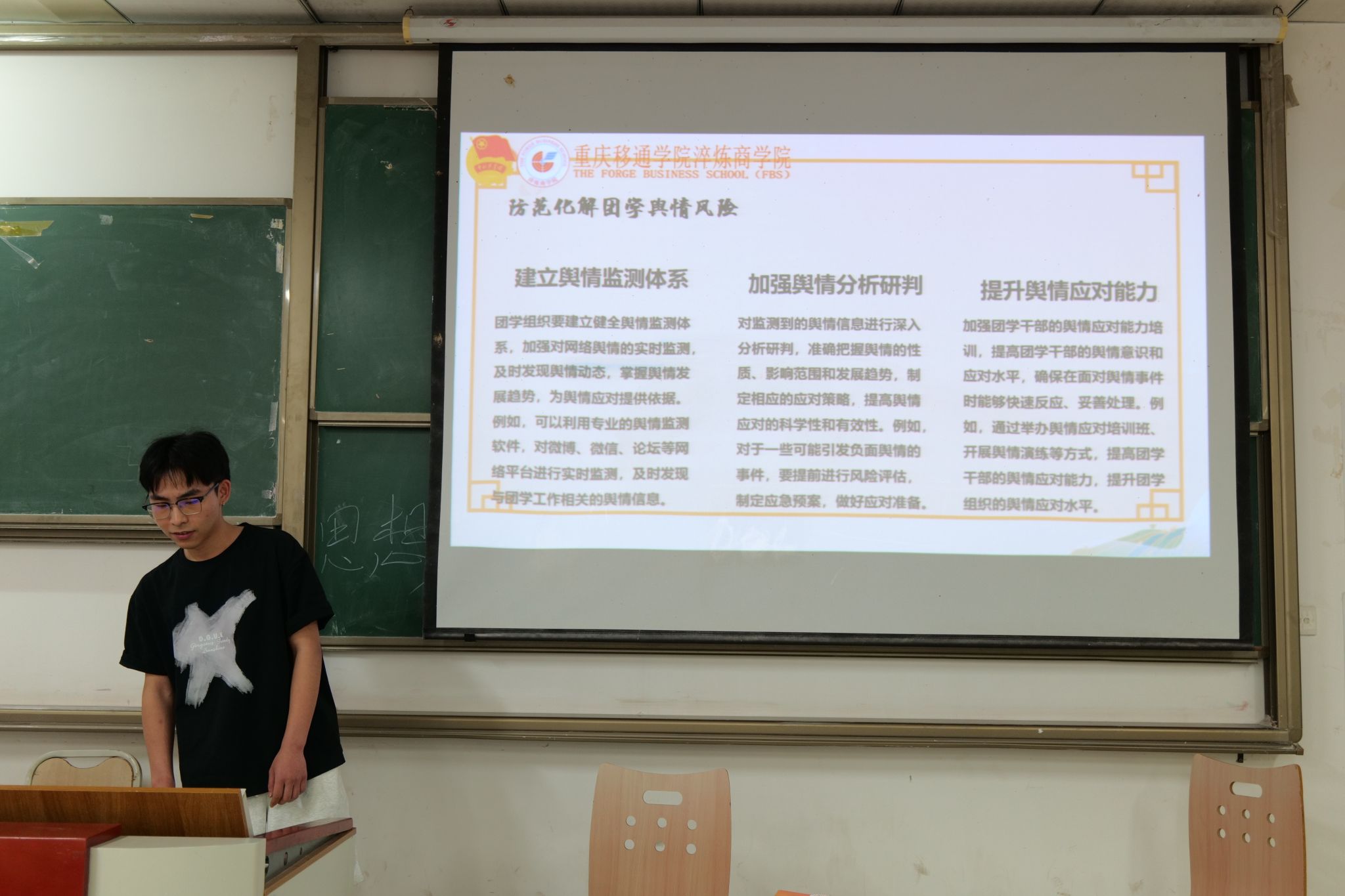 在团学舆情风险管理工作中,学生骨干们表示在日常观察与信息收集,暂未发现不良舆情现象。针对舆情防控长效机制建设,淬炼商学院团总支学生副书记罗亮指出,团学组织要建立健全舆情监测体系,加强对网络舆情的实时监测,及时发现舆情动态,掌握舆情发展趋势,为舆情应对提供依据。同时,学生骨干们要强化舆情分析研判能力,从事件性质、传播范围、影响深度等维度进行综合评估,精准预判发展趋势,制定相应的应对策略,提高舆情应对的科学性和有效性。