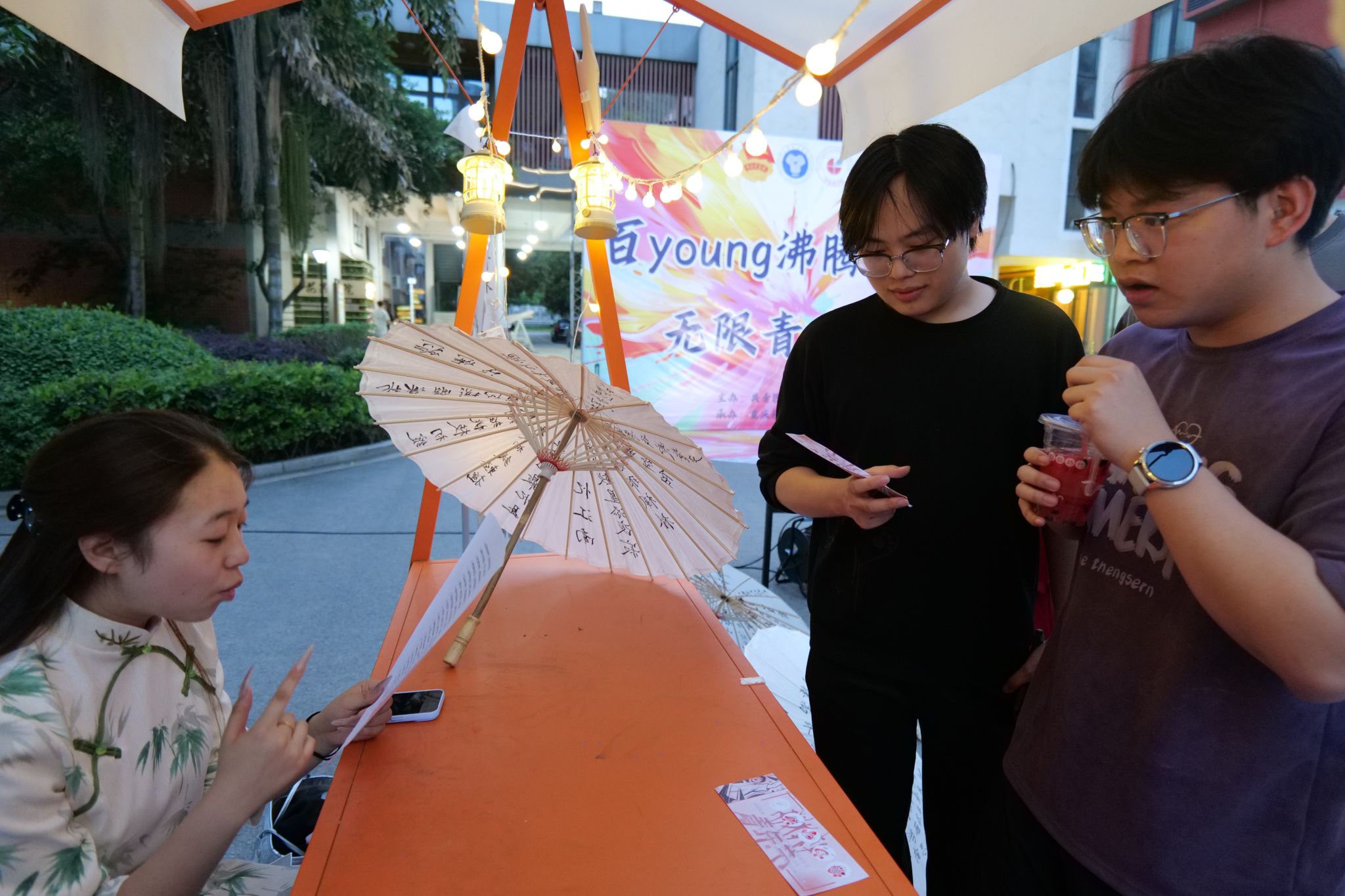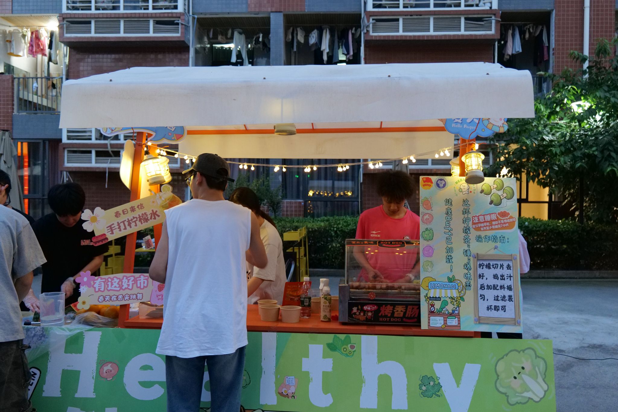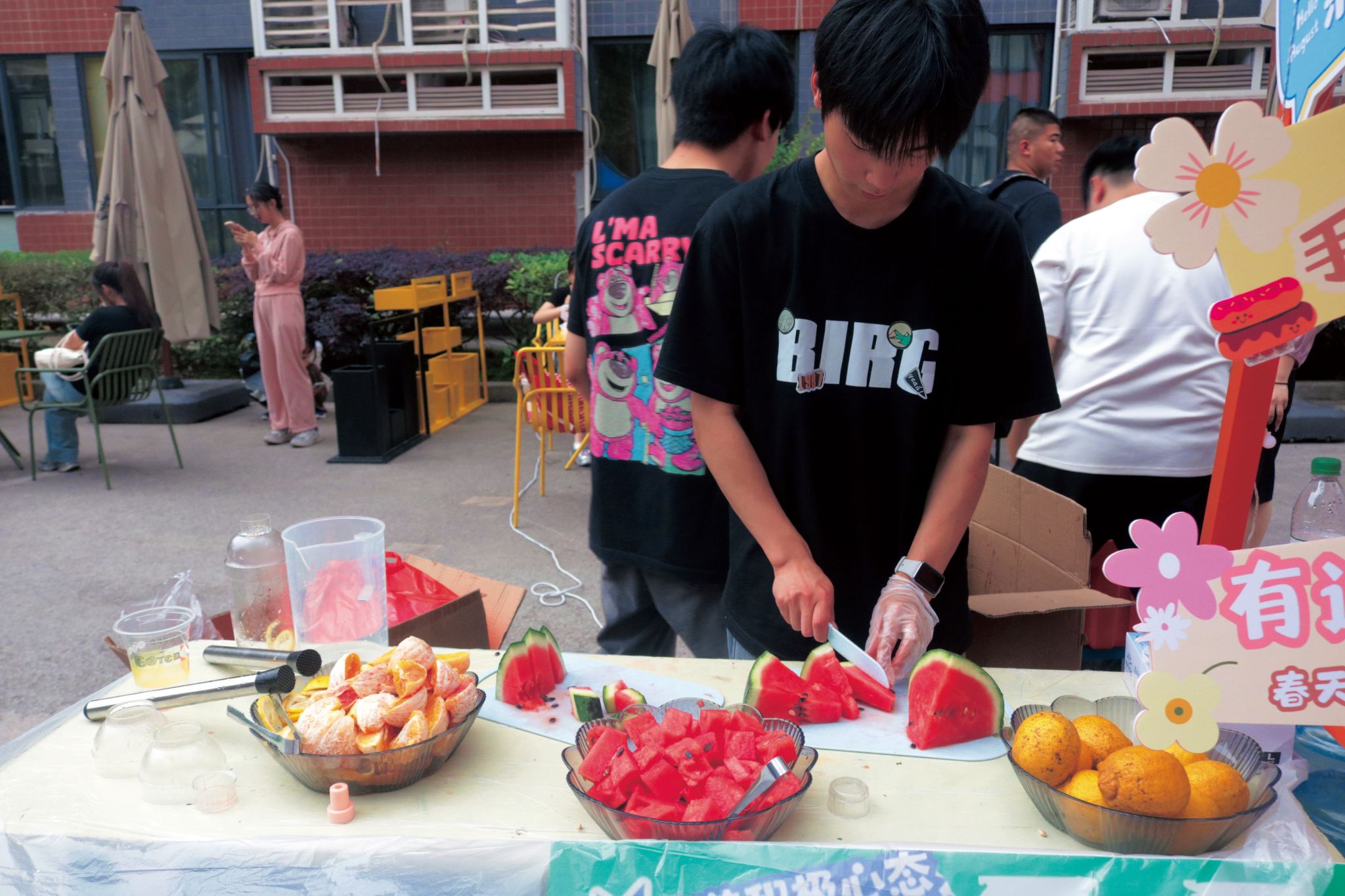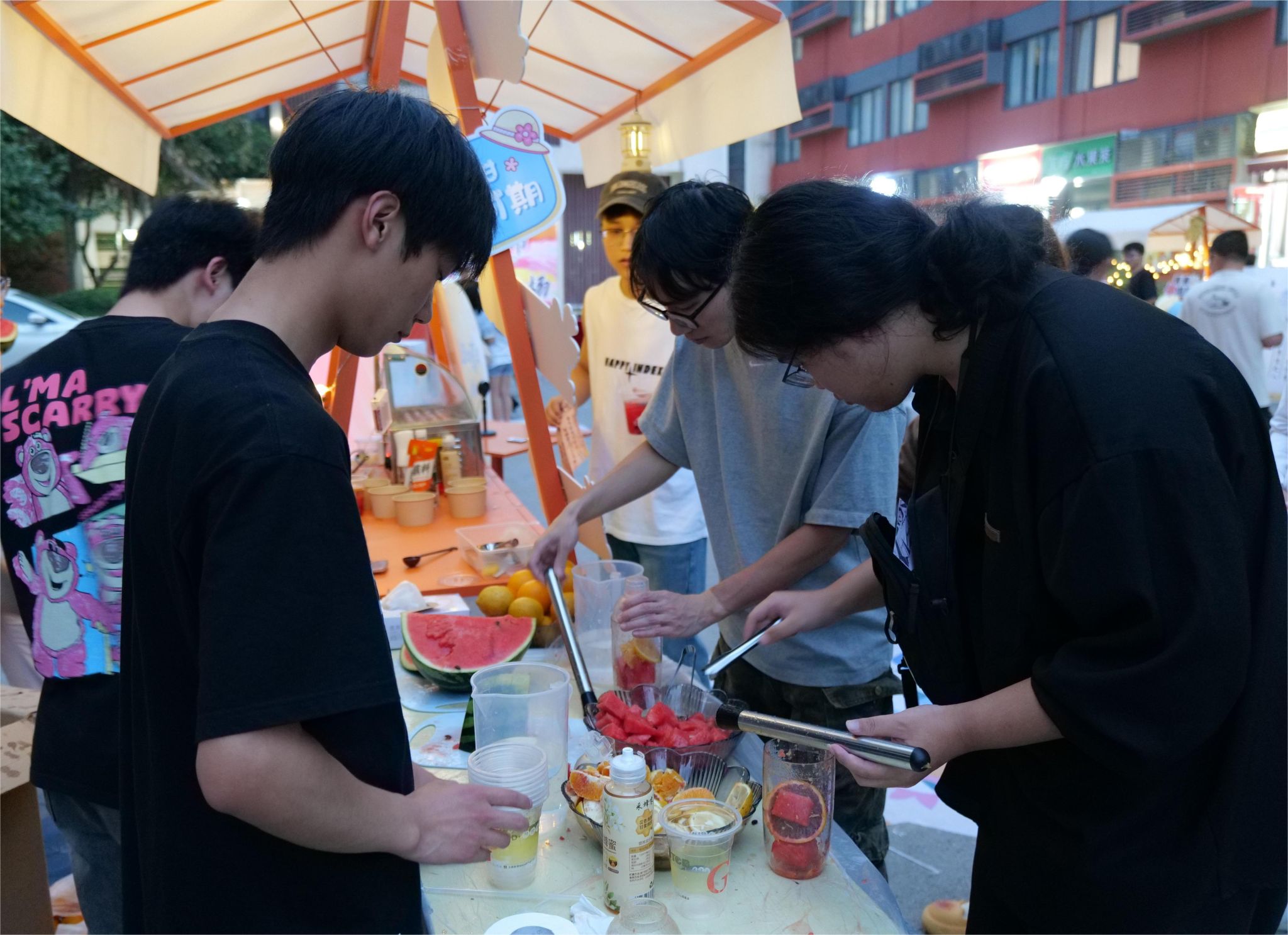 手工养生摊位前,新鲜的水果碰撞上冷萃茶底,同学们10秒钟的暴风捶打,陶瓷杵撞击玻璃钵的叮咚声,十秒暴风捶打出的不止是果香四溢的冷萃茶,更是压力随飞溅汁液迸裂的快意,现场飘满着清新的香气,热气腾腾的烤肠,唤醒每一位在场同学们的嗅觉和味蕾,在快节奏生活中移通青年用自己的方式释放压力,去享受这片刻的宁静与放松。