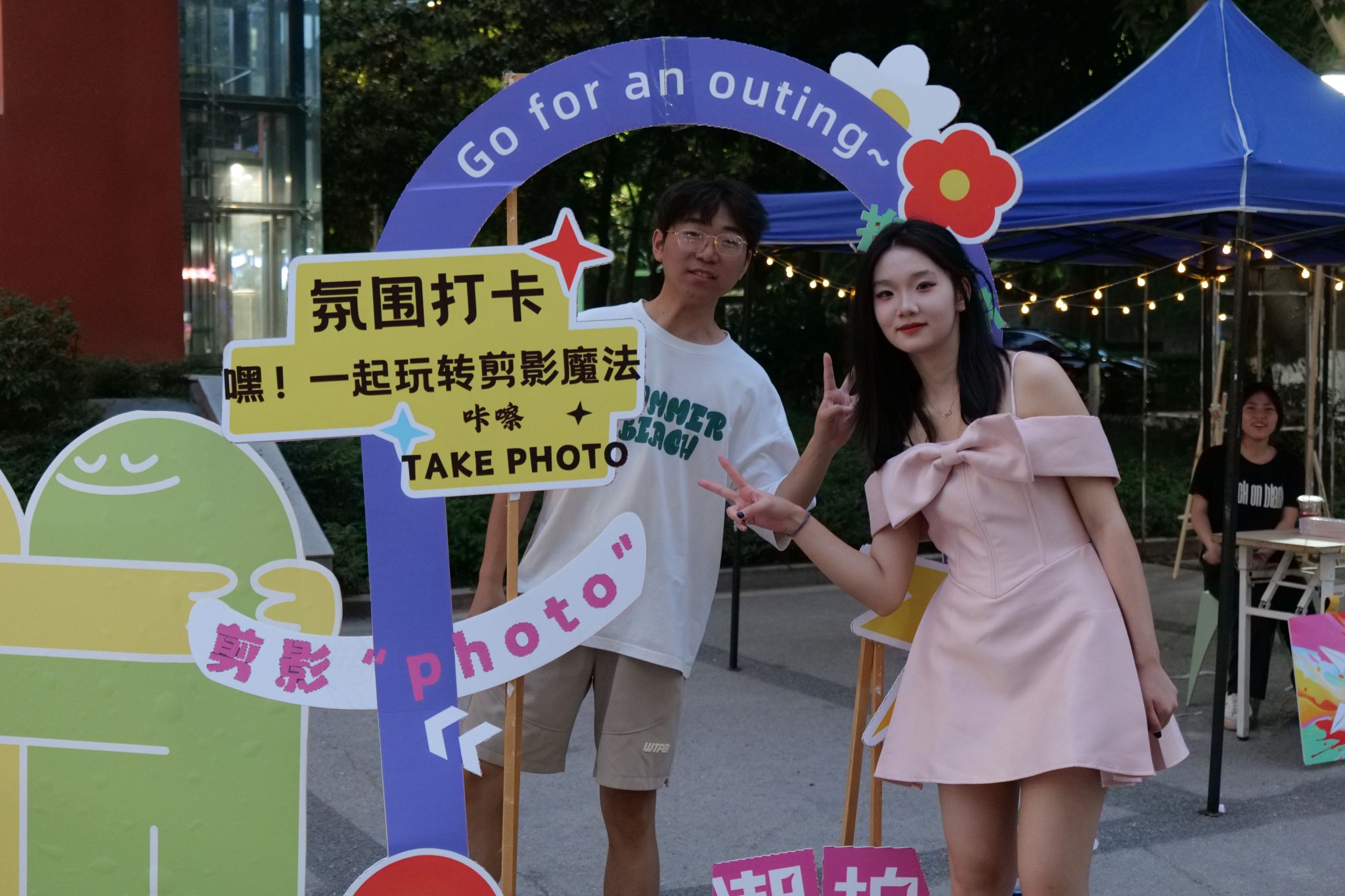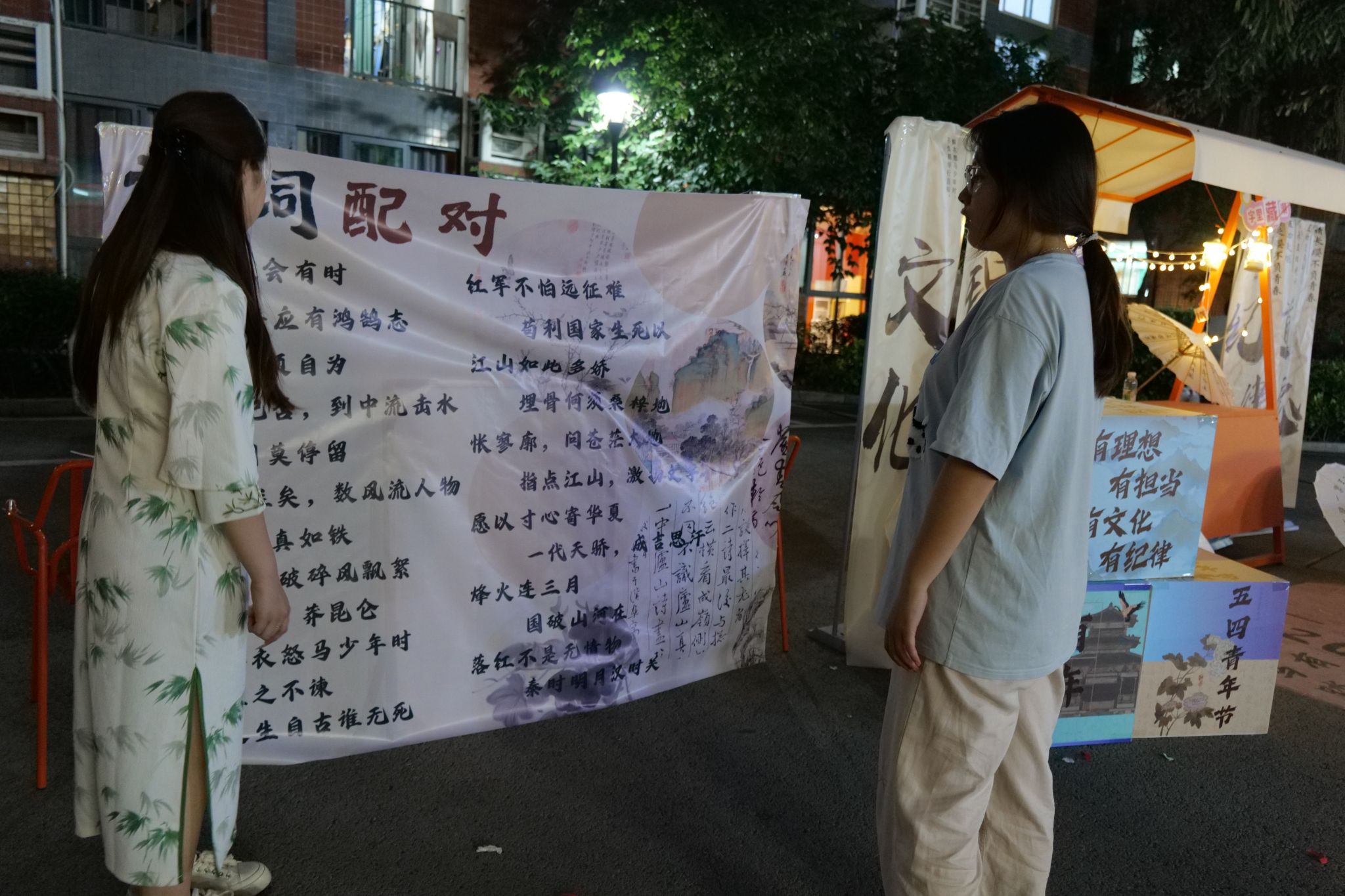 在"四有青年·诗词对对碰"展位前,墨香与青春气交织升腾,同学们手持诗词卡片,围绕"理想、道德、文化、纪律"四大主题展开创意接龙,从主题词库中精心挑选诗句,或抒壮志豪情,或显深沉内敛,巧妙融合诗词韵味与“四有”精神。移步"青春快闪区",落日的余晖映照在幕布中,移通青年的每一张打卡,每一份笑容都展现了青春向上活力,把落日装进移通青年心中,用笑容装饰夜晚,快门按下的瞬间,飞扬的衣角、比耶的手指、跃起的剪影,在投影墙上汇成流动的青春长卷。