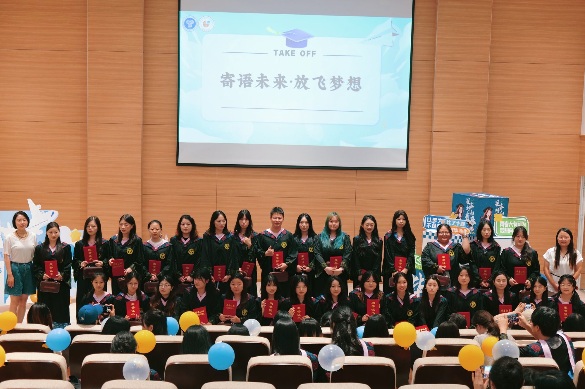 在《颁奖典礼进行曲》中,学院领导与教师代表分六组为228名优秀毕业生颁发证书。据统计,这批优秀毕业生中,有人以专业排名前1%的成绩摘得国家奖学金,有人带领团队在全国商赛中斩获金奖,有人扎根志愿服务传递温暖力量。“看到他们获得荣誉证书的瞬间,仿佛看到无数小飞机在知识蓝天中展翅。”观礼的大三学生赵娅同学感慨道。