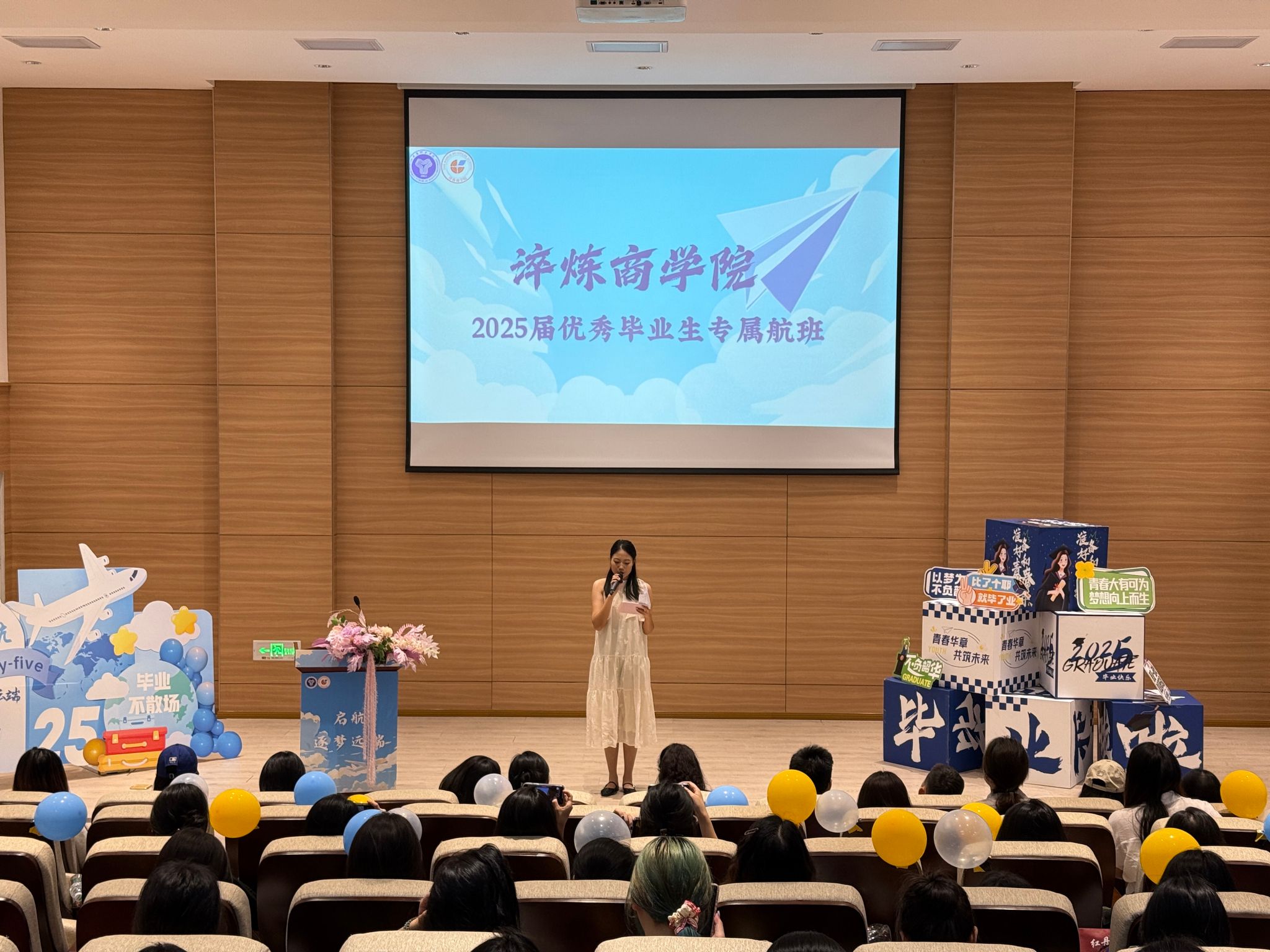 在表彰仪式尾声,优秀毕业生们满怀深情地在纸上写下对母校的感恩、对学弟学妹的祝福以及对未来的憧憬。“愿母校再创辉煌”“以青春之名,赴时代之约”等真挚话语跃然纸上。随着一声号令,承载着美好期许的纸飞机乘风而起,在空中划出美丽弧线。这漫天纸飞机,既是毕业生与母校的深情告别,也象征着他们将带着在商学院积累的知识与力量,以昂扬姿态奔赴山海,让商学精神在新时代绽放新的光芒。