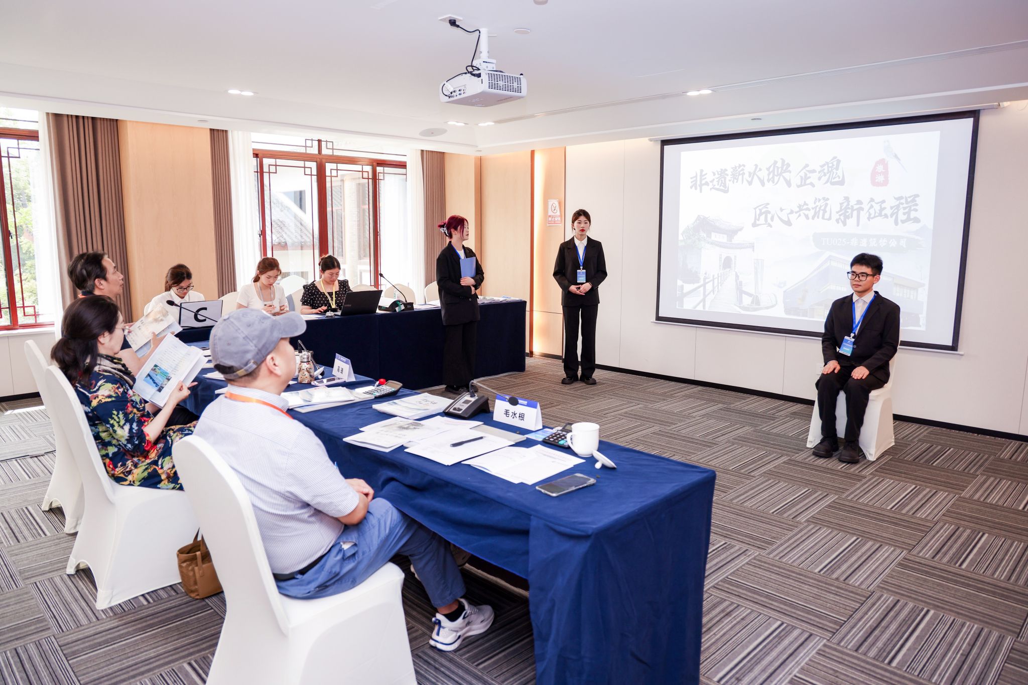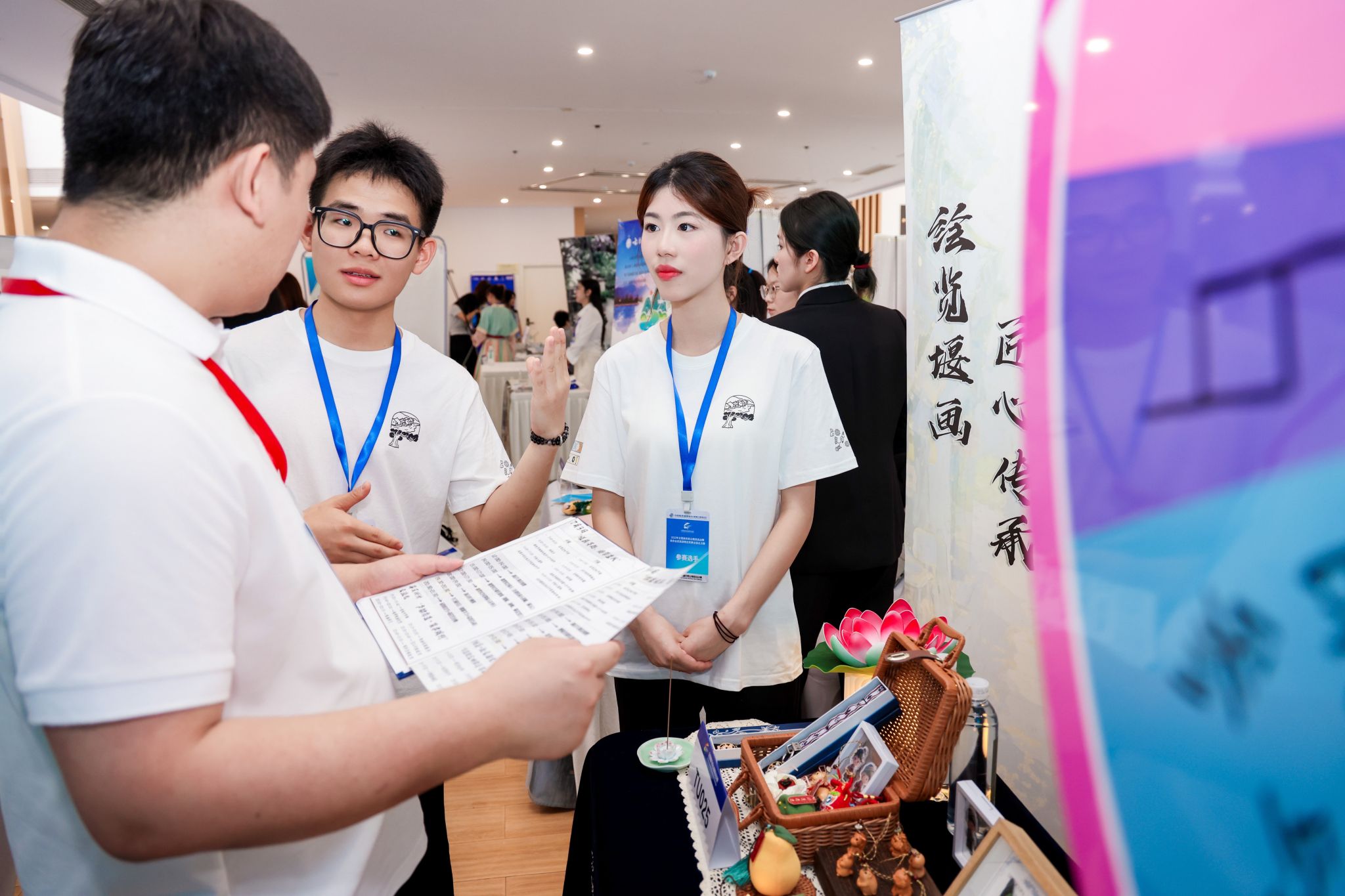 6月21日上午8点半,2025年全国高校商业精英挑战赛商务会奖旅游策划竞赛全国总决赛正式拉开帷幕。“非遗筑梦公司”团队成员们早早来到场地,精心布置展洽会现场的物流。会场气氛热烈非凡,95支来自全国各地高校的优秀队伍齐聚一堂,纷纷展示着各自风采,竞争异常激烈。“非遗筑梦公司”团队抽到的答辩序号是C16(C组别16号),尽管当天天气十分炎热,但丝毫没有影响队员们的发挥,下午2点30分,团队准时上台进行展示!