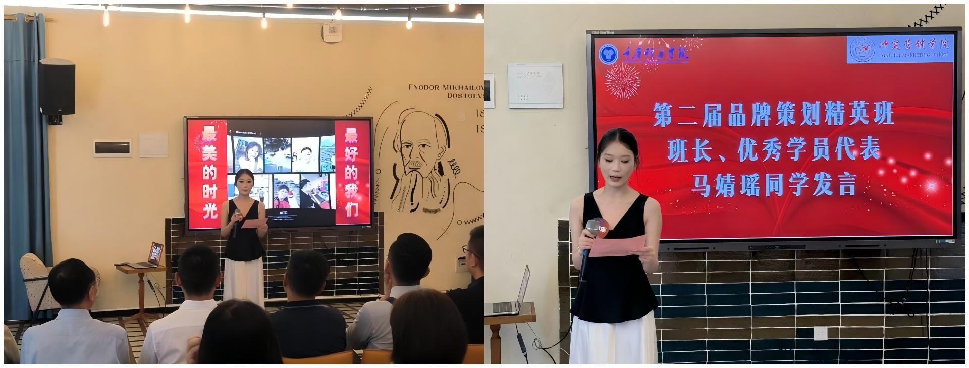 随后,活动正式进入结业颁奖典礼环节。结业仪式的一开始,由学员们精心准备的暖场节目——本届精英班回顾视频拉开了序幕,珍贵的回忆记录瞬间点燃了现场的氛围,让在场的每一位嘉宾与学员都沉浸其中。随后,学生代表在发言中回顾了精英班的学习历程,从最初的理论知识学习到如今能够独立完成品牌营销策划项目,他们感慨万分,感谢学院提供的学习平台与机会,也感谢所有授课教师与指导嘉宾们的悉心教导,他们在代表全体学员表达了对学院、老师和企业嘉宾的感激之情的同时,也分享了自己参与精英班学习的心得体会与收获,表达了对未来职业生涯的憧憬与坚定信心。