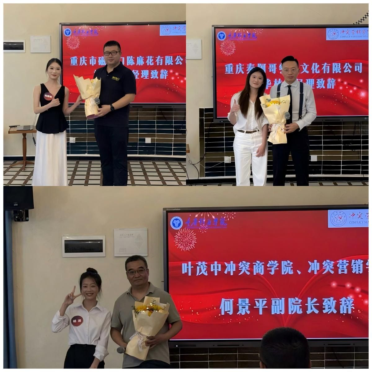 2025年6月21日,重庆移通学院冲突营销学院迎来了一场意义非凡的盛会——第二届精英班实训项目品牌营销策划评审会暨结业颁奖典礼。出席此次活动的评委及嘉宾有:冲突营销学院副院长何景平,重庆陈昌银麻花有限公司总经理杨学武、总经理助理王锋,重庆秦阿哥餐饮文化有限公司总经理秦华林,重庆致微科技有限公司总经理杨云,重庆市荷花米花糖(集团)有限责任公司总裁助理黄国文、销售部长唐云川,冲突营销学院主管董道进,市场营销教研室教师孙可可、张锦文、寇小玲、唐思蓉、潘泉宏,以及精英班全体学员。活动由冲突营销学院主管董道进主持。