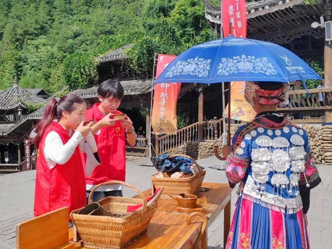 苗寨文化广场上,十二道拦门酒的热闹场景,让实践团成员们开启了一场沉浸式的苗族非遗文化之旅。身着华丽苗服的苗家姑娘们,手持大碗,在寨门前筑起十二道“酒门”,发髻上的银饰随着欢快的山歌轻轻晃动,裙摆间绣着的吉祥纹样也仿佛在跳动,用热情似火的拦门酒歌,迎接远方而来的客人。成员们端起酒杯,感受着酒液入口的醇厚,也体会到苗族人民待客的豪爽与真诚,纷纷用相机定格下这极具民族特色的迎宾瞬间。