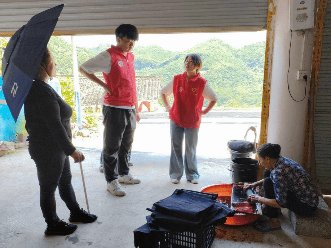 情郎村作为拥有独特侗族文化的村落,蓝靛染技艺在这里源远流长。实践团成员来到晾晒染布的场地,上前与正在晾晒染布的居民深入攀谈,村民张女士提到:“这蓝靛草啊,得选雨季刚过的嫩株,采回来先泡水三天,再加石灰发酵二十天,发酵时得天天翻搅,温度高了低了都不行。” 张女士指着身旁装满蓝靛染料的陶缸,向实践团成员细细讲解,从原材料的采集、发酵,到染色的技巧和注意事项,每一个环节都饱含着先辈们的智慧。实践团成员认真记录工艺流程,用镜头定格传统技艺的魅力,助力这份千年匠心在新时代焕发新生。