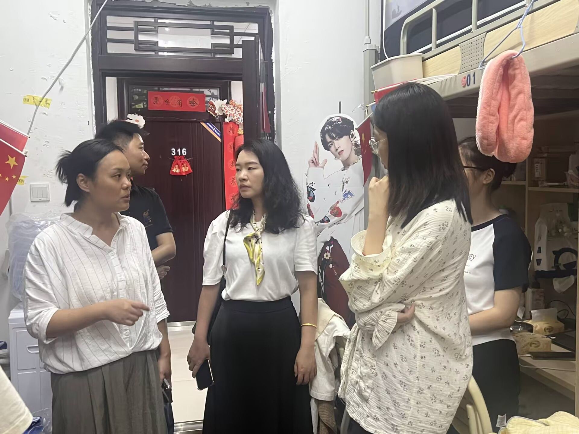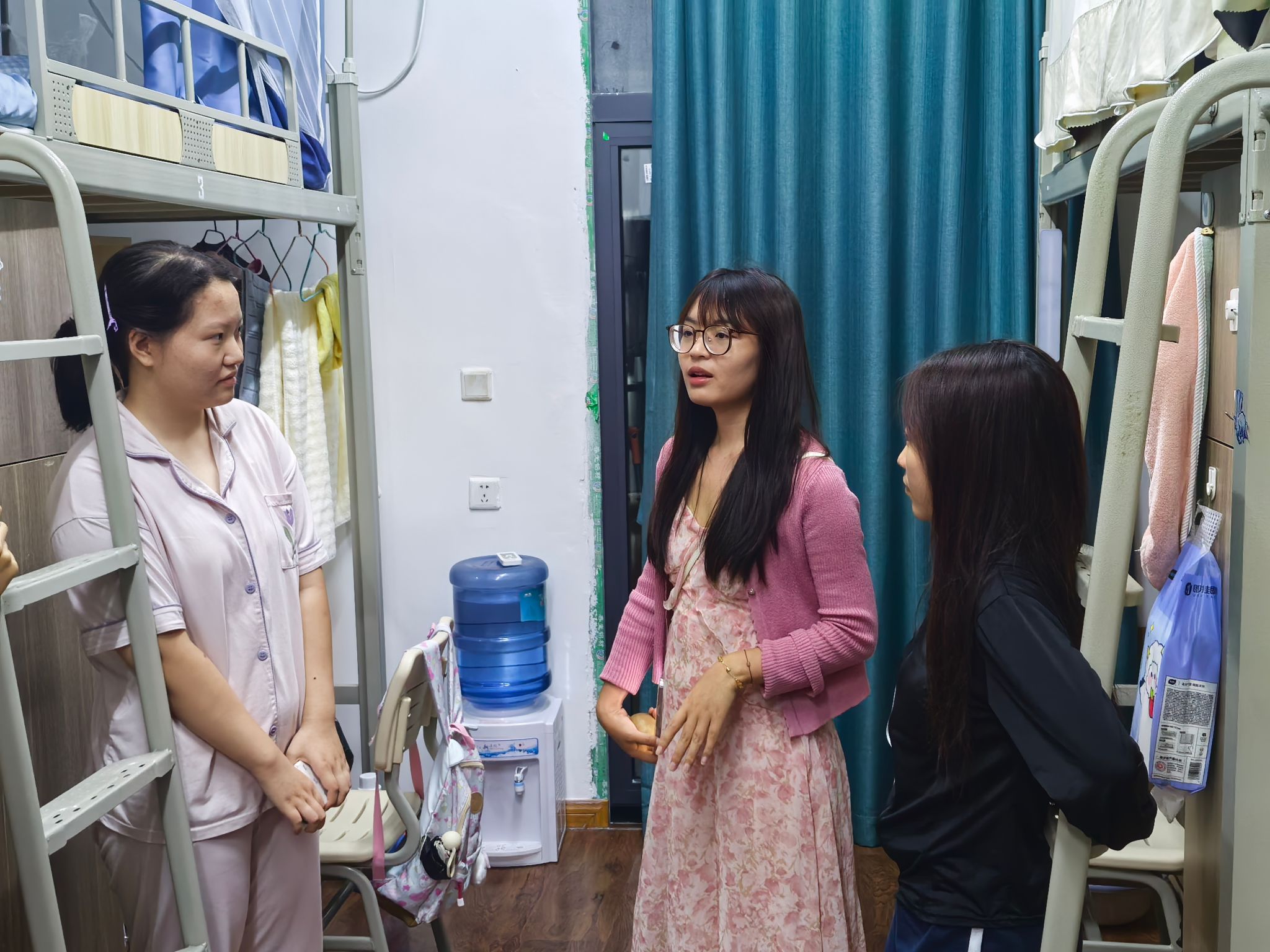本次院长接待日以宿舍恳谈的形式展开。集合完毕后,刘书记与辅导员们依次走进学生宿舍。不少宿舍已整理得整洁有序,书本摆放整齐,处处透着新学期的崭新气息,同学们见到老师主动起身交流,展现出积极向上的精神面貌。各辅导员在交流之余,开展了宿舍安全检查,重点查看用电线路、消防设施及储物摆放情况,对存在的安全隐患及时提醒整改,为同学们营造了安全、温馨且充满关怀的住宿环境。