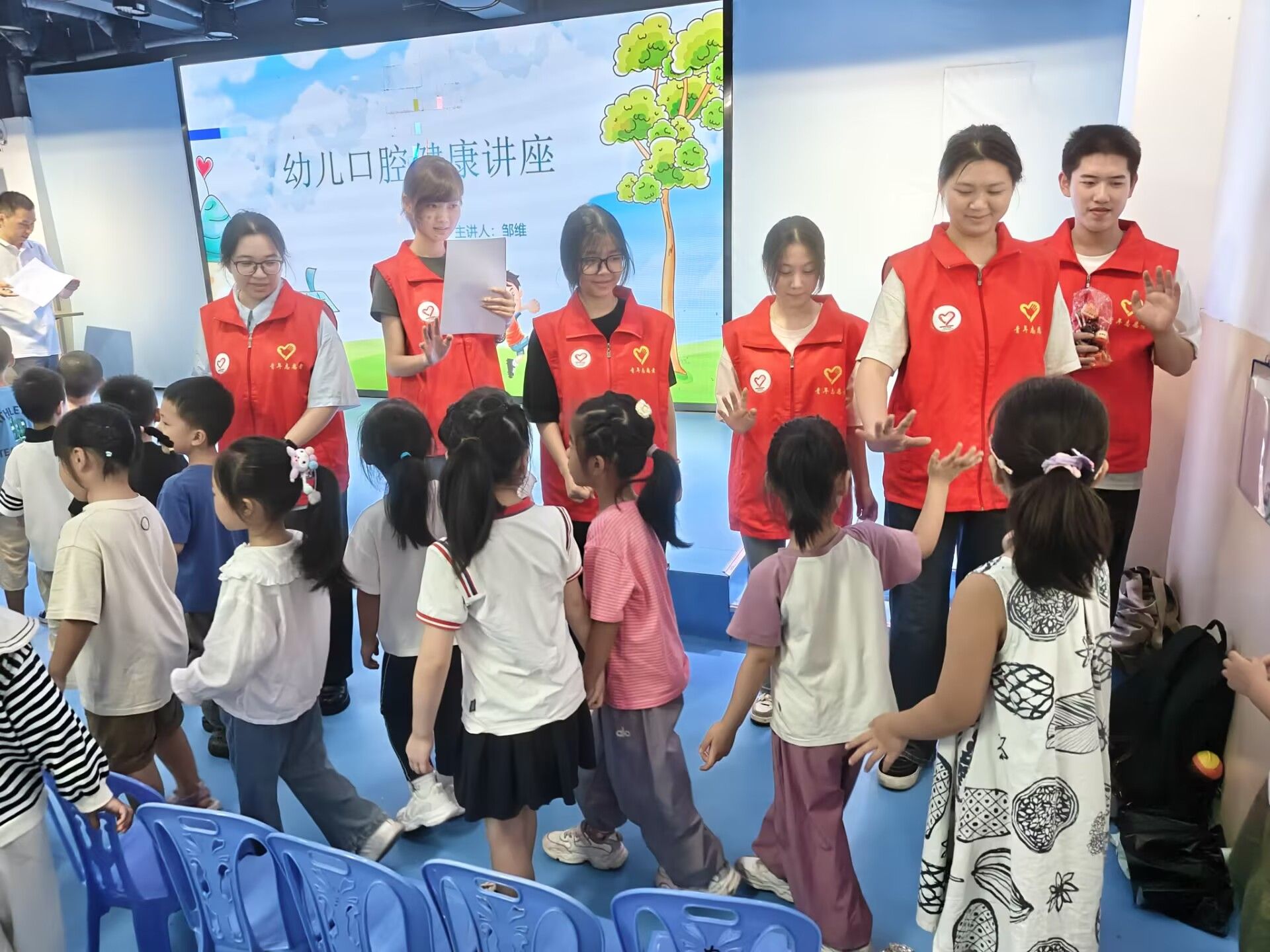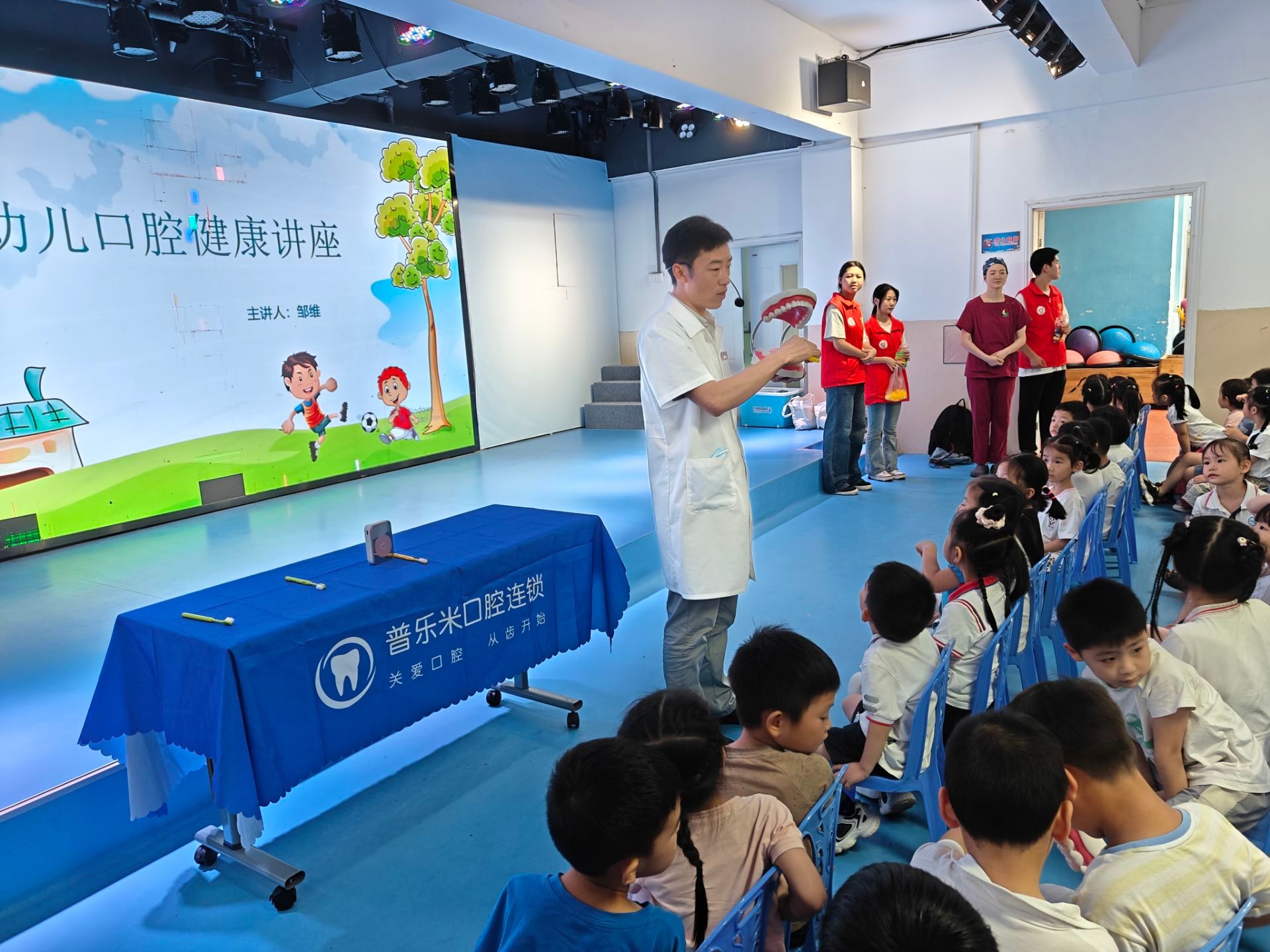 志愿者与普乐米口腔医院的医护人员一同,为新华小学附属幼儿园的小朋友们带来了一场别开生面的口腔知识讲座。医护人员结合活泼生动的动画短片进行了专业讲解,向小朋友们介绍了全国爱牙日的由来,志愿者们也协助医护人员为小朋友答疑解惑。小朋友们踊跃与医护人员、志愿者们互动,还通过传阅口腔模具来学习巴氏刷牙法,在轻松愉悦的氛围中领会爱护口腔的重要意义,从而增进对口腔健康与成长关联的认识,开启关注口腔健康的旅程。