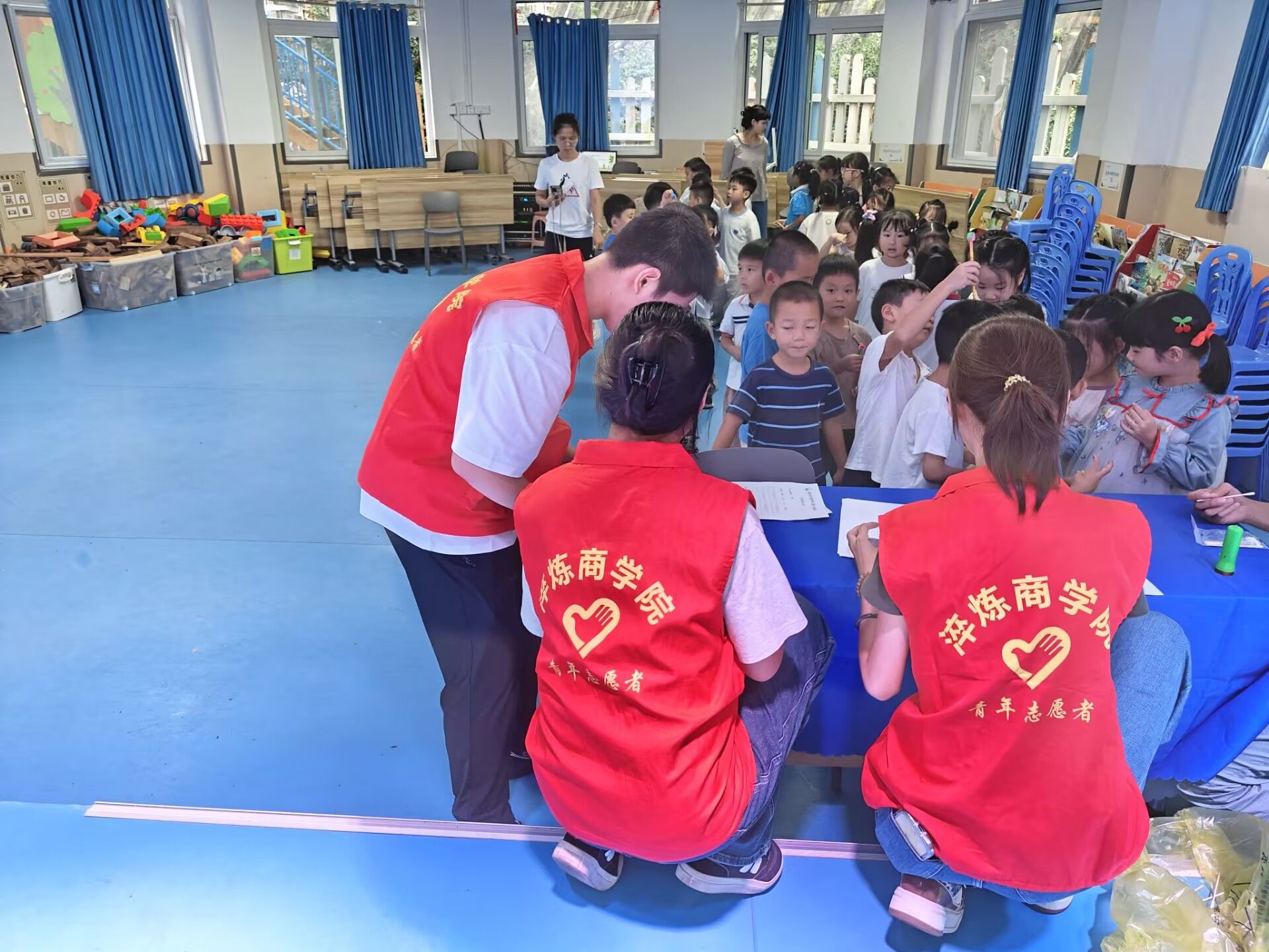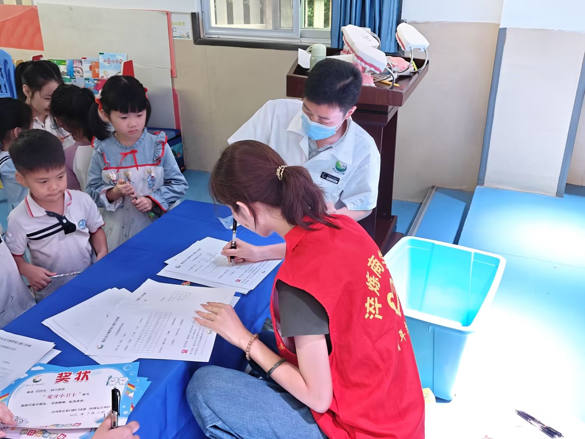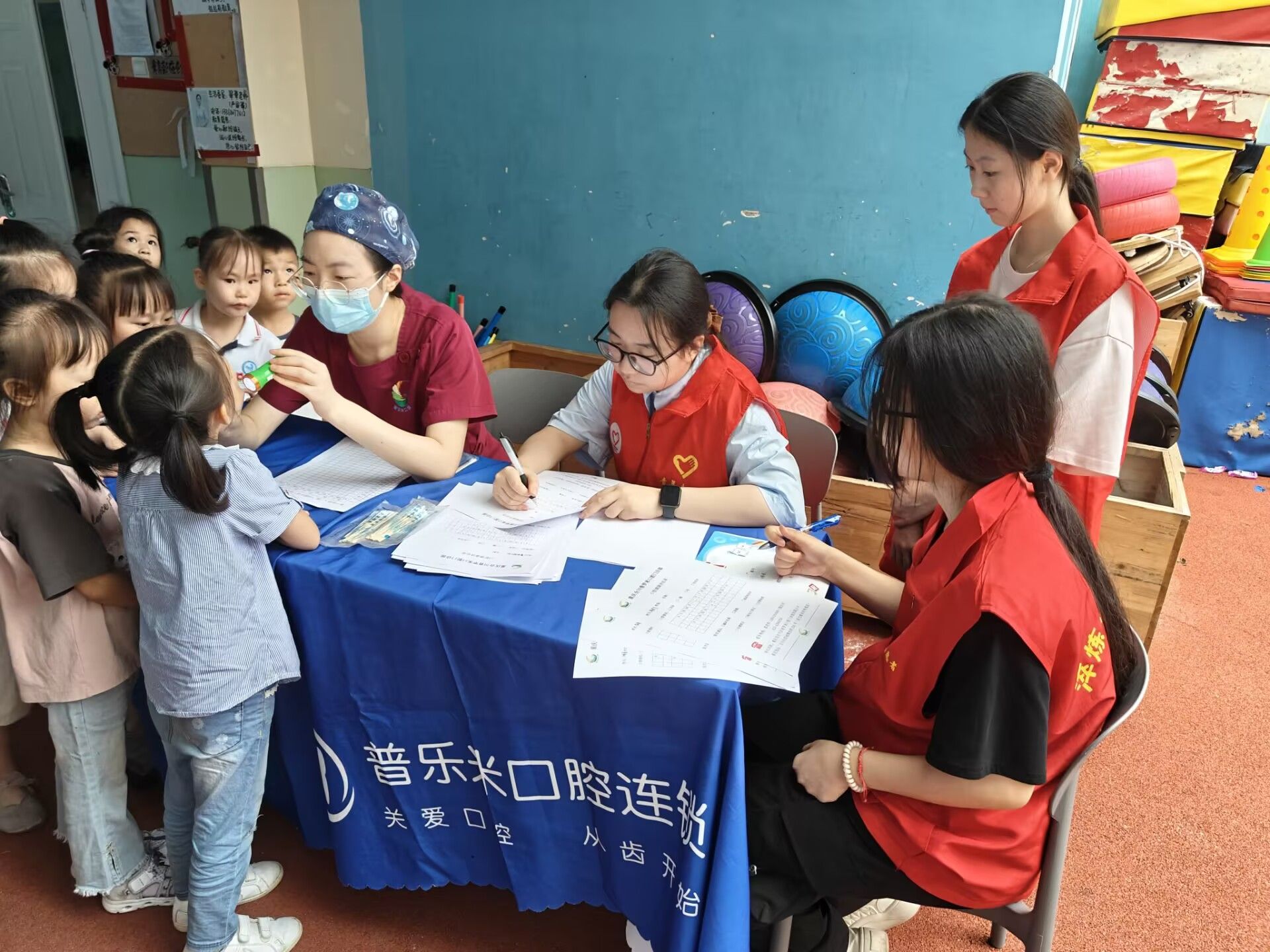 随后的口腔检查环节中,医护人员细致地为每位小朋友进行口腔检查,及时筛查龋齿等常见问题。志愿者们温柔地引导孩子们配合检查,安抚他们的情绪,并认真记录检查结果。这些详实的记录将为后续家校沟通提供依据,助力家长更好地关注孩子的口腔健康状况。