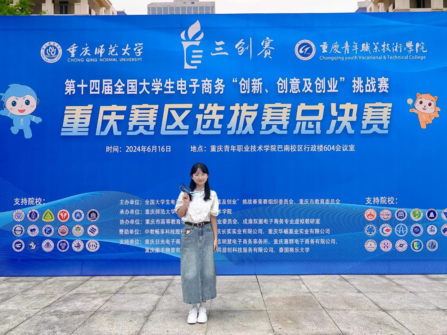 2025年全国企业竞争模拟大赛,面对“三个女生玩不转沙盘” 的质疑,她带着团队把实验室当“家”:30余次赛前训练练到手指发酸,无数个复盘夜熬到眼睛发红,终于从“小白队伍”逆袭成全校第一,再凭市赛一等奖晋级全国赛,从2000余支队伍中突围拿下国家级二等奖;“三创赛”里,她带新手团队从零起步,调研市场、优化方案,4个月让抖音账号涨粉3000+,助农产品咨询量增长30%,最终站上重庆赛区总决赛领奖台;首届全国中小企业品牌营销案例大赛,她牵头改了10余次方案、优化50多处细节,熬夜写出1.2万字案例书,为团队赢回2万元奖金。“逐光的路上,没什么‘不可能’。” 这是她在赛场上学到的最重要的事。