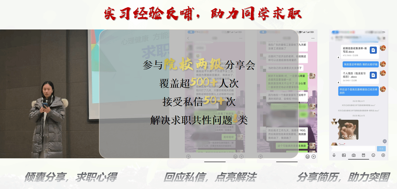 实习归来后,我非常荣幸受邀为同学们进行求职经验分享,期间也收到很多相似困境小伙伴们的私信,我积极回应并帮助同学修改完善简历,累计覆盖500余人,解决求职共性问题8类,有效提升了同学们的就业竞争力。