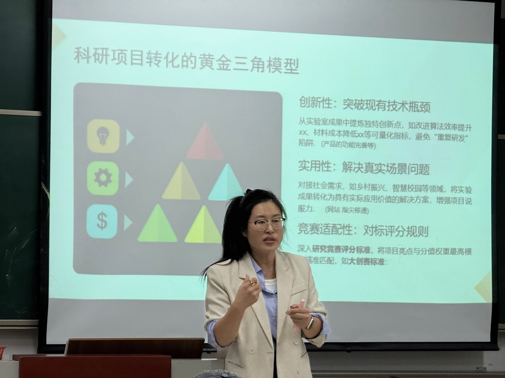 科研竞赛转化的关键痛点是成果困于论文难落地和对赛题的理解浅显。郭老师借助这两个痛点提出黄金三角模型推进,以创新性破解技术瓶颈提炼成果亮点,实用性对接需求转化方案,竞赛适配性匹配评分绑定高权重模块;再用STAR法则明情境、定任务、述方案、展结果,助力实验室高效适配竞赛项目。帮助学生提升在竞赛中的竞争力,实现自我能力的突破。