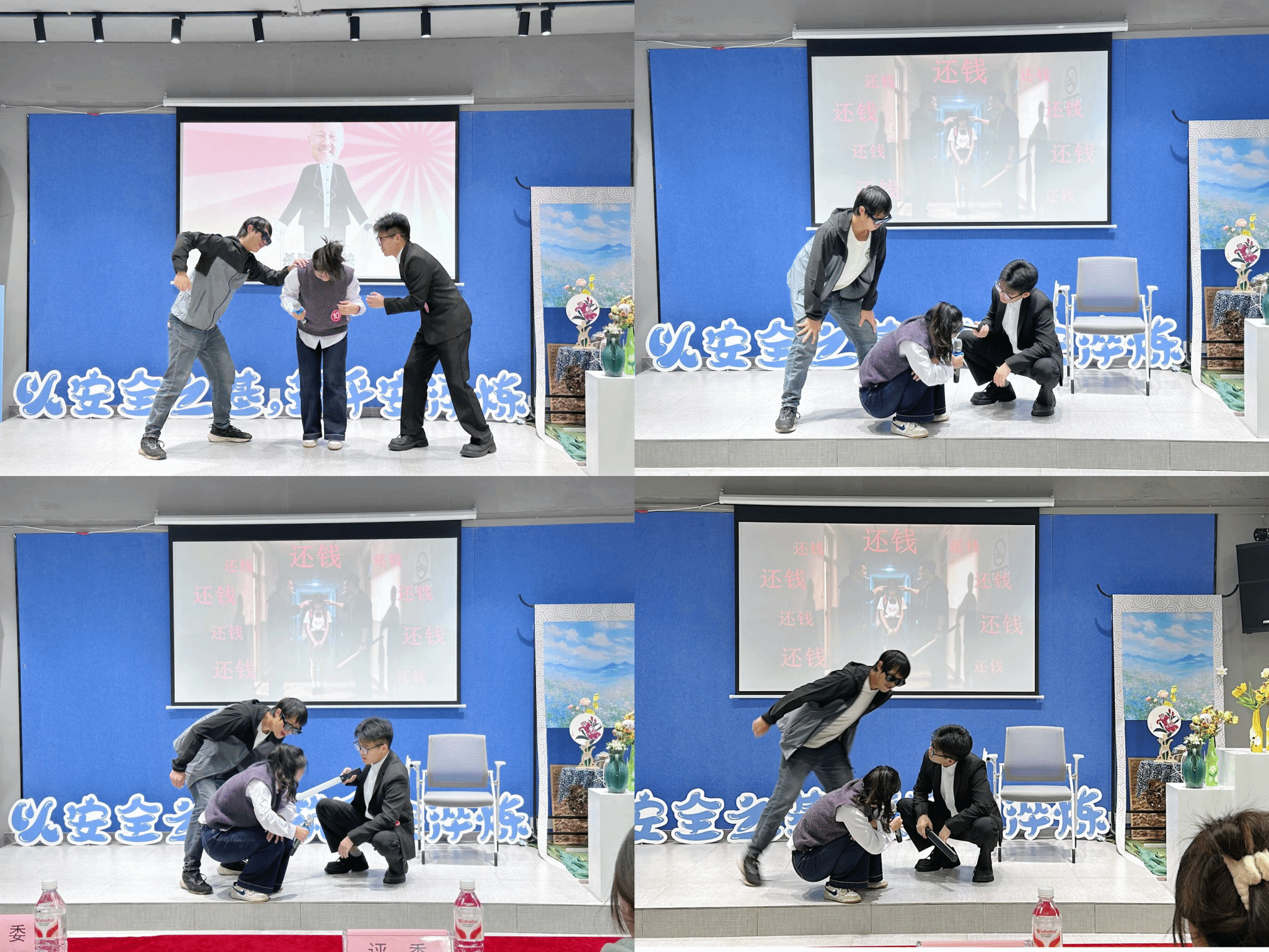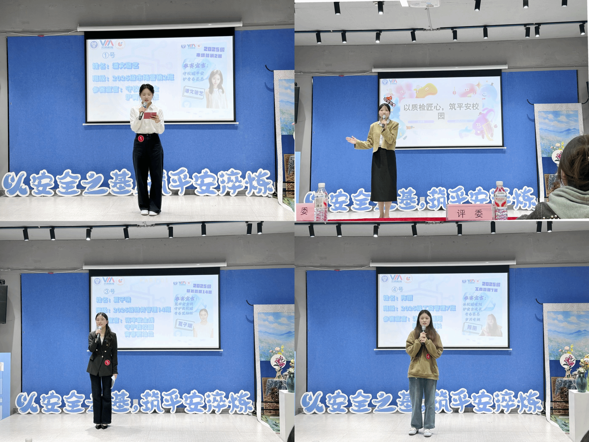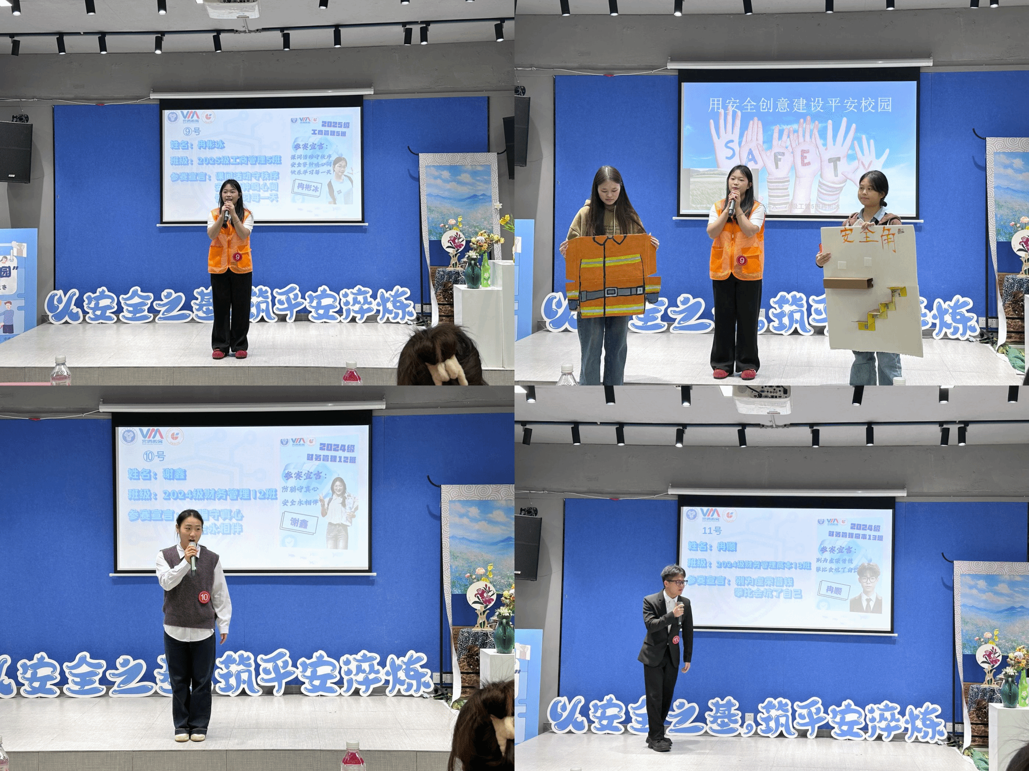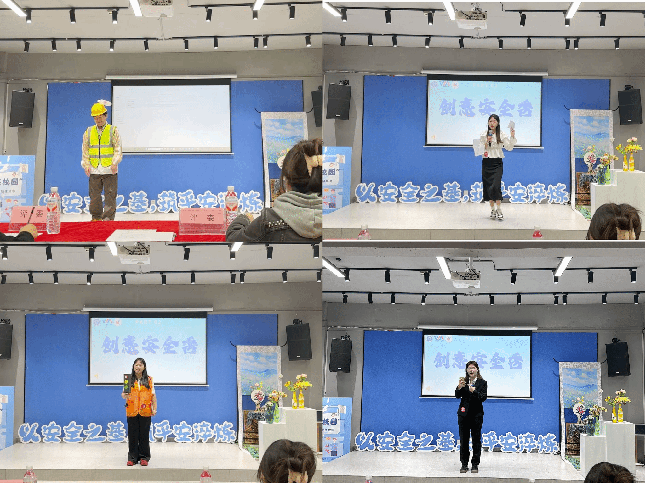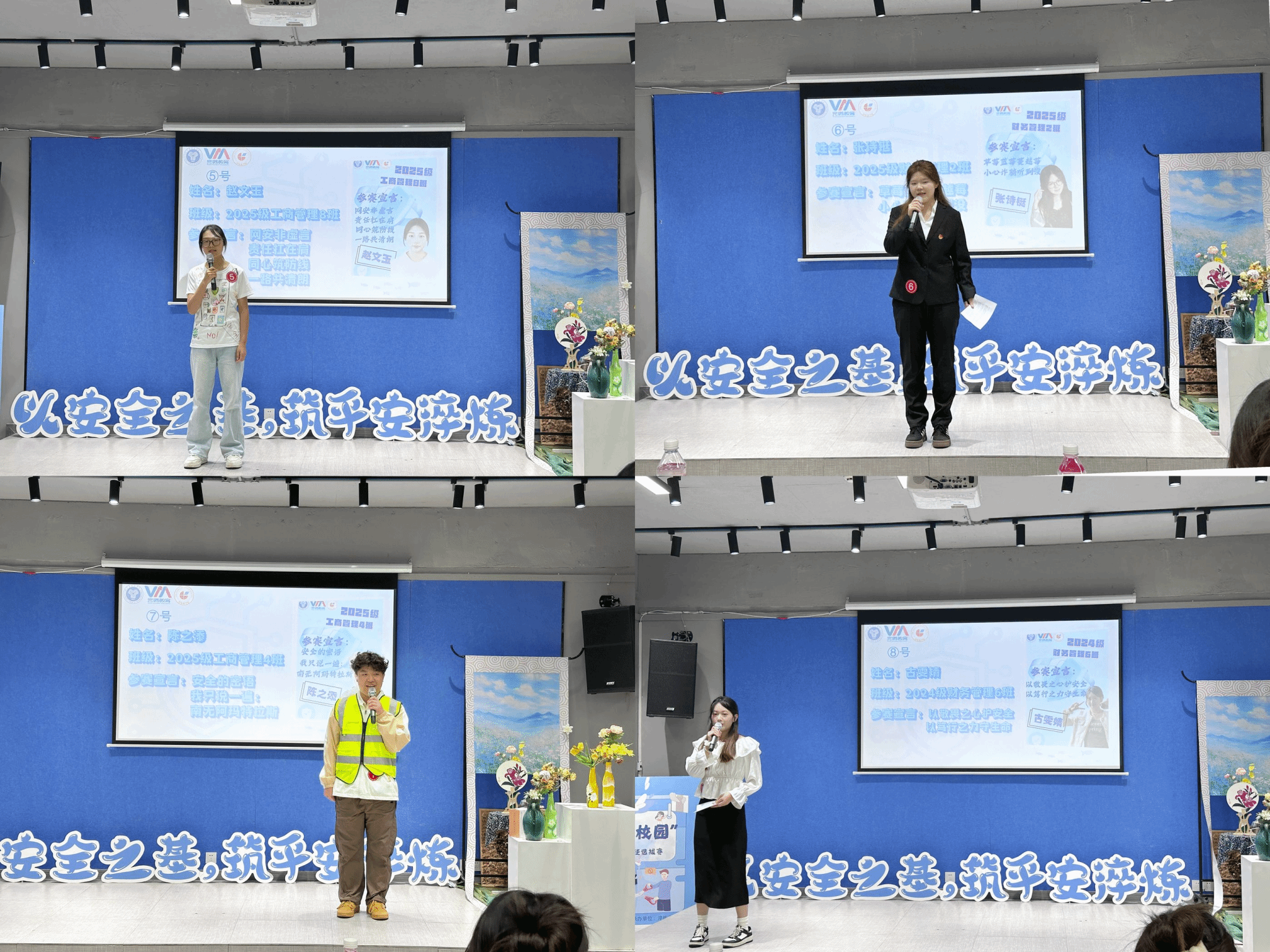 “主题演讲秀”现场,选手们脱稿而立,以安全为笔,书写青春担当。2号选手聚焦校园安全,结合“违规电器模拟展示台”,将电路过载的危害娓娓道来;7号选手聚焦高空抛物,为我们现场演绎到的后果,警示同学们注意安全;9号选手聚焦消防安全,手动制作了安全册与消防服装,现场讲述消防的重要性;11号选手聚焦网络借贷安全,以自问自答的情景剧,剖析高利贷的风险性。