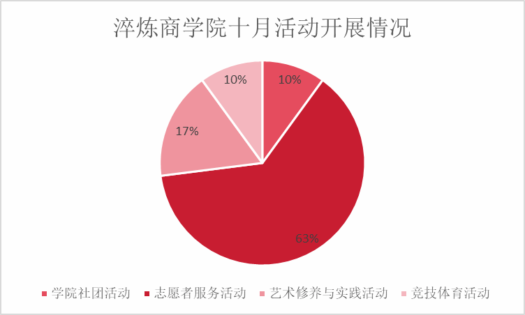 秋意盎然,硕果盈枝。十月里,淬炼商学院强化“学生为中心,活动为载体,成长为目标”的意识,成功举办了30场完满教育活动,其中校园社团活动3场、志愿服务活动19场、艺术修养与实践活动5场、竞技体育活动3场,累计活动参与者人数约7520人。