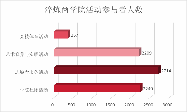 本月淬炼商学院完满教育活动以“四位一体”为底色,为淬炼学子们的校园生活增色添彩。据统计,志愿服务活动参与逾2714人次,在奉献中彰显青年担当;校园社团活动席卷近2240人次,于协作中点燃创意星火;艺术修养与实践活动吸引超2209人次,在探索中积淀艺术风韵;竞技体育活动汇聚约357人次,于拼搏中铸就强健体魄。