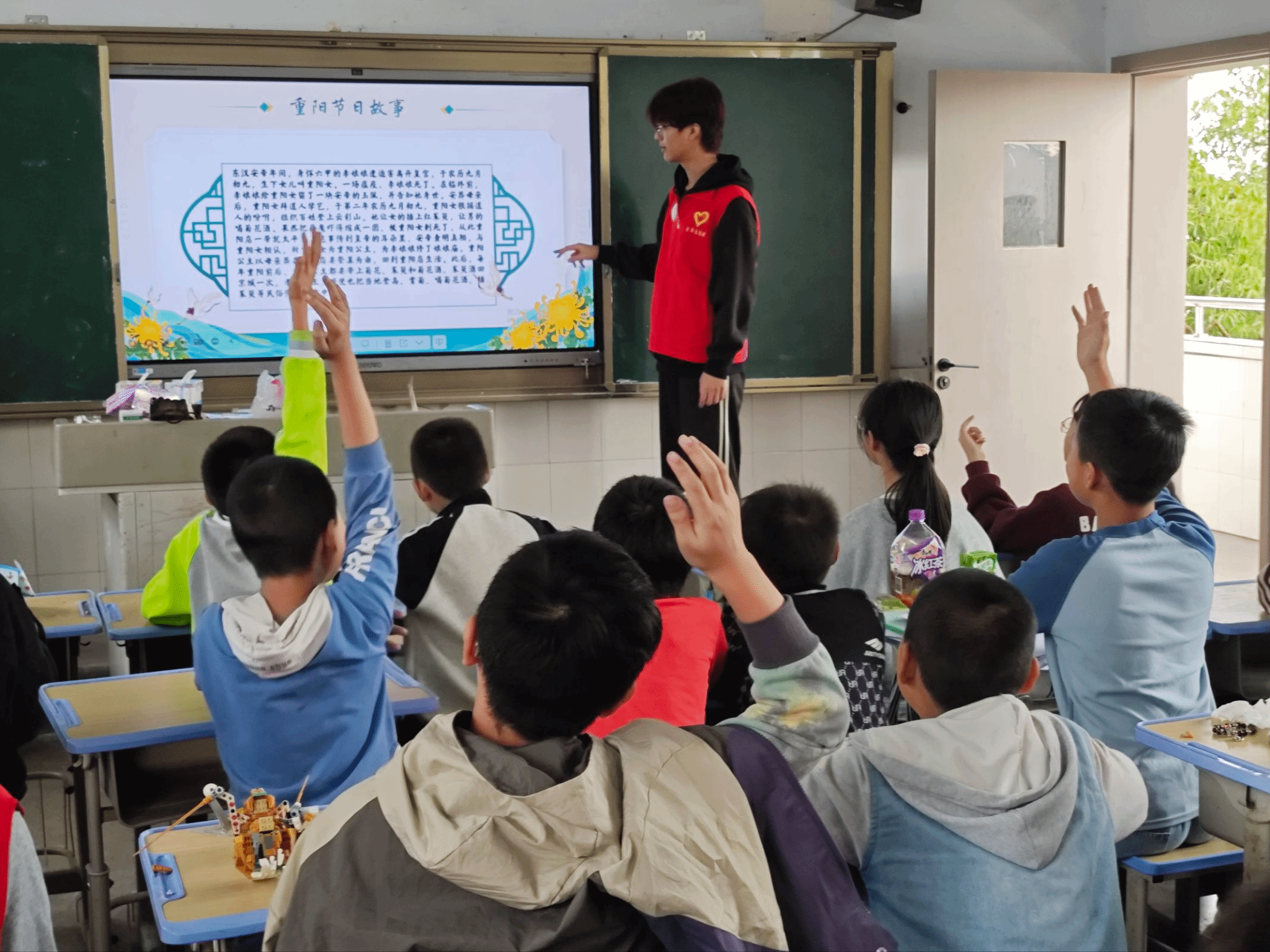 活动开场,志愿者们化身“传统文化讲师”,用清楚明了的PPT为孩子们开启了重阳节知识的探索之旅。从“九九重阳”的吉意,到上古秋收祭天的渊源,再到登高、赏菊、插茱萸、吃重阳糕的习俗,连茱萸的用处、糕团的甜香都讲得鲜活。课堂上,孩子们认真听讲,不时举手提问,志愿者们耐心解答的同时,还穿插了趣味小故事,现场互动氛围热烈,传统文化的魅力在一问一答间静静流淌。