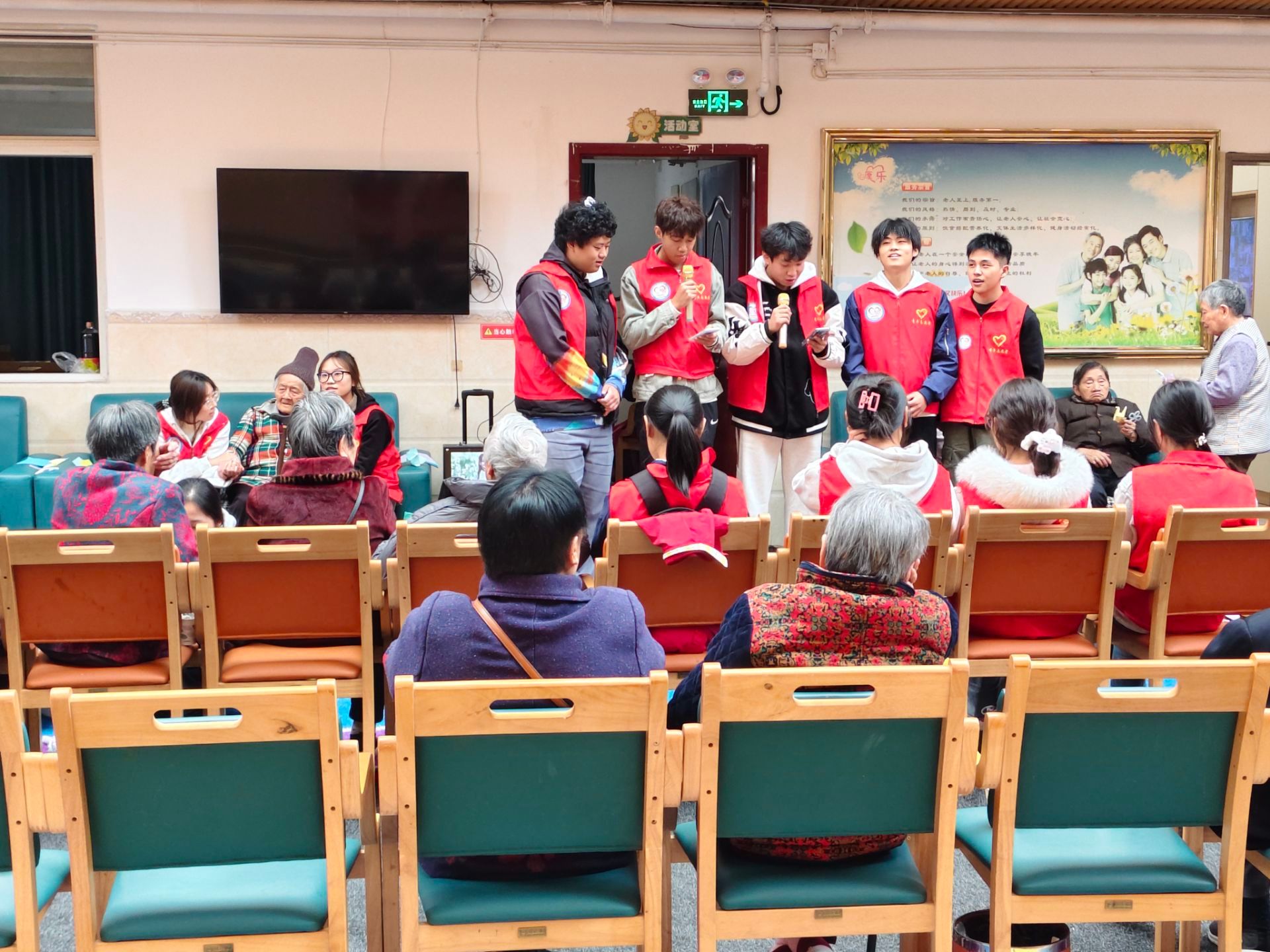 有的同学则发挥特长,为老人表演精心准备的节目——《映山红》《茉莉花》等经典红歌合唱引发全场共鸣,几位擅长戏曲的老人甚至主动加入,与学子们同台演唱,悠扬的旋律在活动室里久久回荡。还有的成员默默做起了“小事”:帮行动不便的老人修剪指甲、整理床头衣物,陪视力不佳的老人读报纸、聊时事,用细致入微的举动传递温暖。期间,78岁的张奶奶拉着团支部成员的手感慨:你们一来,屋里就热闹多了,听你们说话就像看到自家孙辈一样亲切。在公寓工作人员的引导下,大家迅速分成多个小组,展开多维度的陪伴服务:有的围坐在老人身边,捧着老相册听他们讲述年轻时的工作经历与生活趣事,从“粮票年代”的奋斗故事到家庭团圆的温馨片段,老人口中的岁月点滴让青年们仿佛穿越时空,触摸到不同时代的生活印记。2025级财务管理15班团支部书记表示:原来陪伴不只是‘送温暖’,更是‘双向奔赴’——我们给老人带去欢乐,老人却用他们的人生阅历给我们上了最生动的一课。