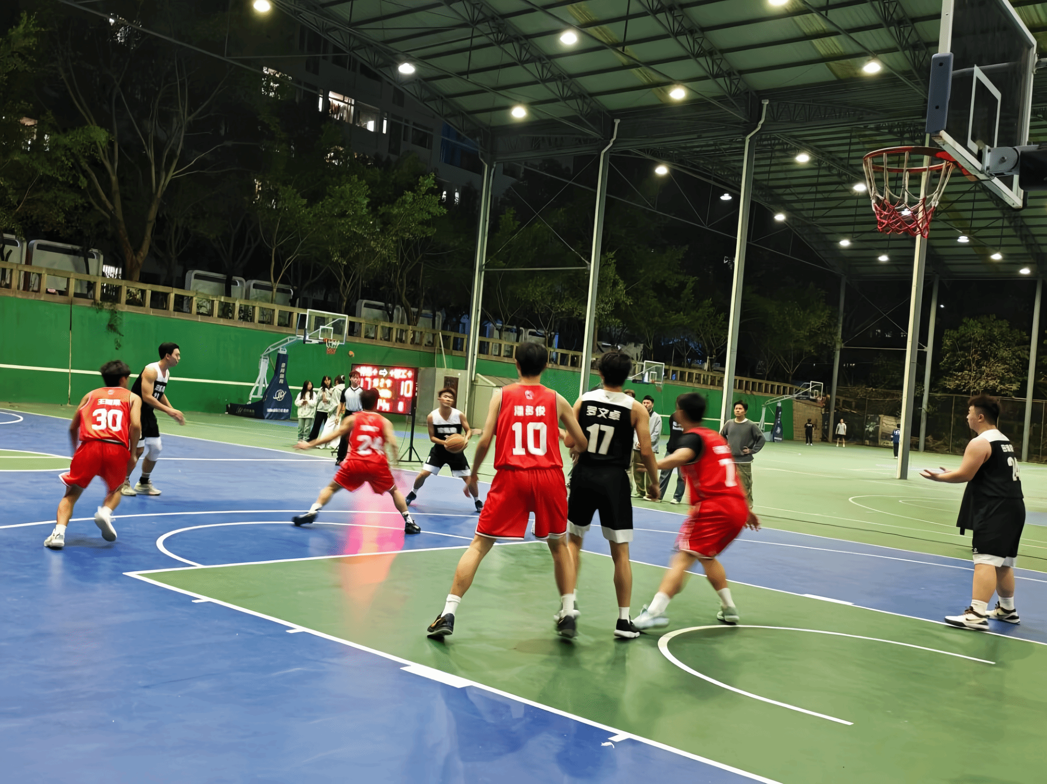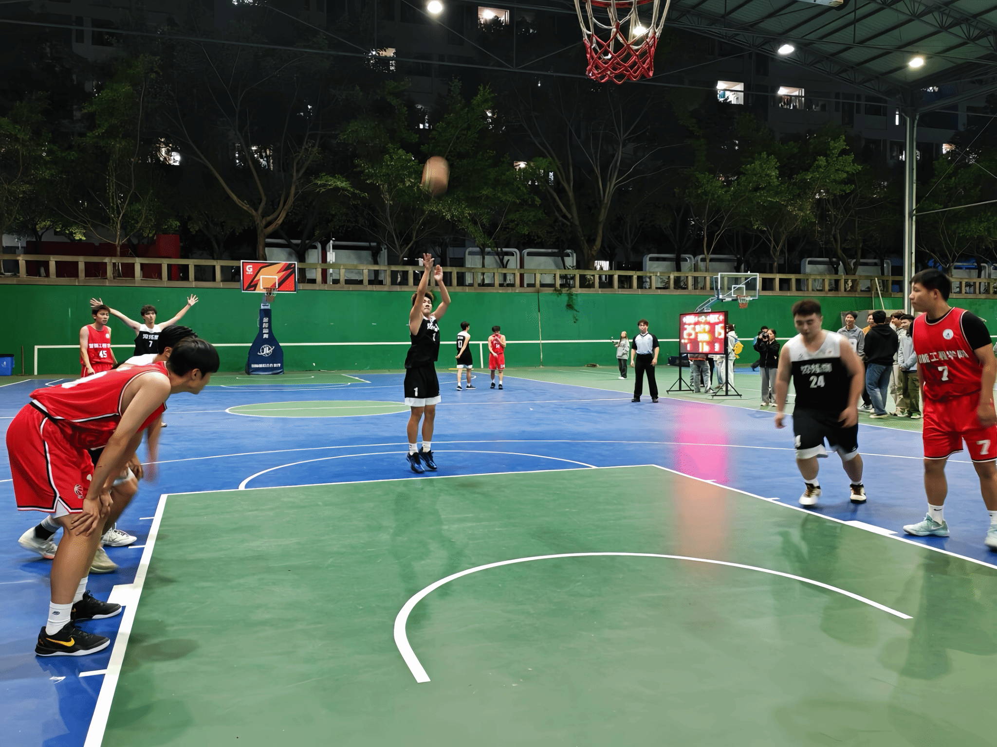 “漂亮!”在一次默契的进攻配合中,队员们通过挡拆顺下,由23号队员完成上篮得分,场边助威的同学们瞬间沸腾。防守端,男女生们也展现出顽强的斗志,面对对手的强攻,用积极的补位和强硬的对抗,一次次将危机化解。尽管身体疲惫、呼吸急促,但没有一名球员退缩,在赛场上尽情释放着对篮球的热爱,每一次冲刺、每一次拼抢都彰显着青春的拼搏与热血。