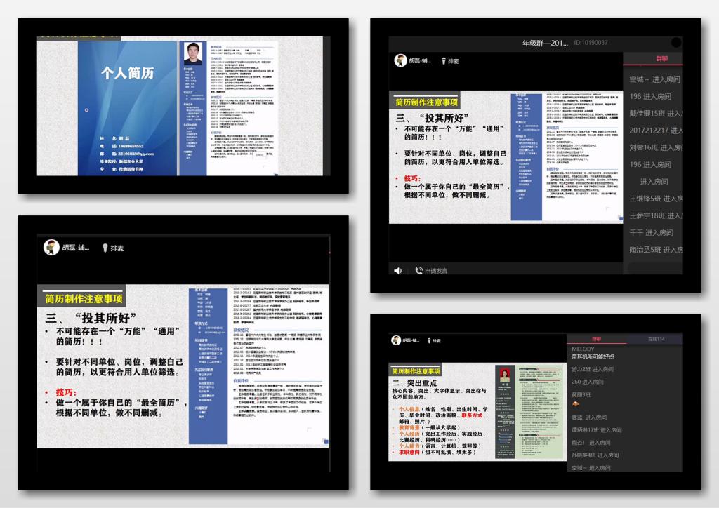 常言道:授人以鱼不如授人以渔。在如今竞争日益激烈的就业市场中,掌握有效的就业信息获取渠道能大幅降低就业的难度,让同学们贏在起跑线上。培训会一开始,胡老师结合自身工作经历,为同学们分享了如何有效的获取就业信息,了解用人单位招聘的来龙去脉,进一步揭开求职的“迷纱”。面对大四最后的一个暑假,很多同学都选择了实习、求职,通过本次培训会,胡老师就简历的制作做了详细讲解,包括简历的基本样式、简历的内容与结构、优秀简历范例以及如何投简历等环节。使大家在制作简历时能够做到规范、美观和有效。