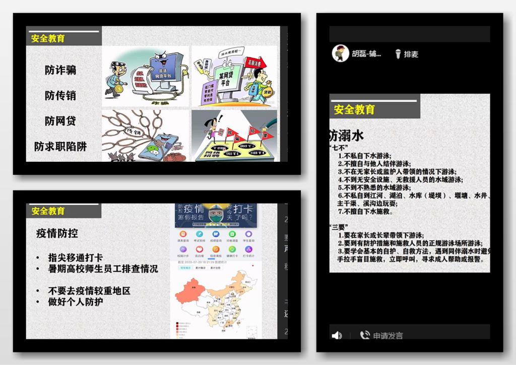 安全教育是一个永久的话题,安全牢牢的记在心中,平安将会相伴一生。结合疫情形势,辅导员提醒同学们在放假期间同样需要时刻关注疫情最新动态,不去疫情较重地区,做好个人防护和坚持每日的疫情打卡。除此之外,还就防求职陷阱、防传销、防网贷、防诈骗和防溺水一一作了安全警示。安全教育不仅为同学们在人身、财产安全等方面敲响了警钟,对促进同学们保持健康心理,提高抵御不安全因素的能力也起到了引导作用,同学们要争取做到防患于未然。