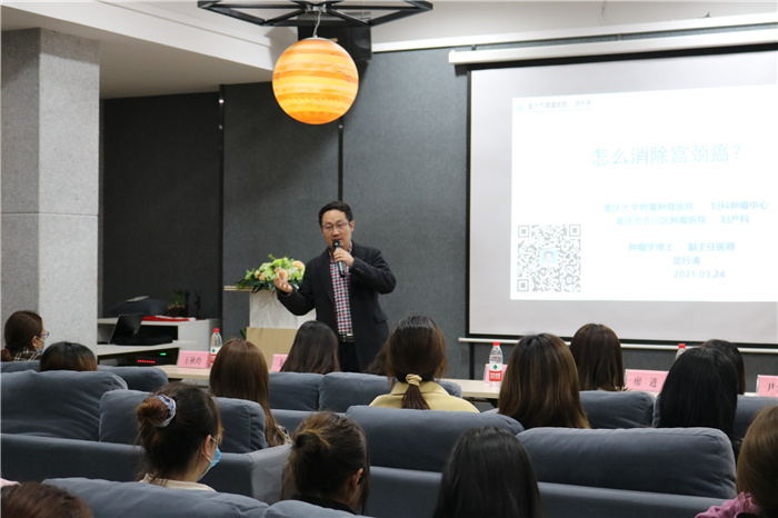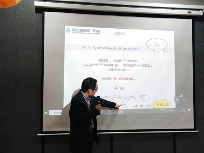 讲座现场,王秋玲主任上台介绍了合川区中西医结合医院妇产科科室的具体情况。随后,龙行涛主任带领在场学员进入了本次座谈会的主题——HPV和宫颈癌的那些事儿。他表示:“作为一名医生、一名教师,我很高兴来到移通,通过座谈会的方式和大家分享有关女性健康方面的知识,让学员们能够更好地保护自己。”