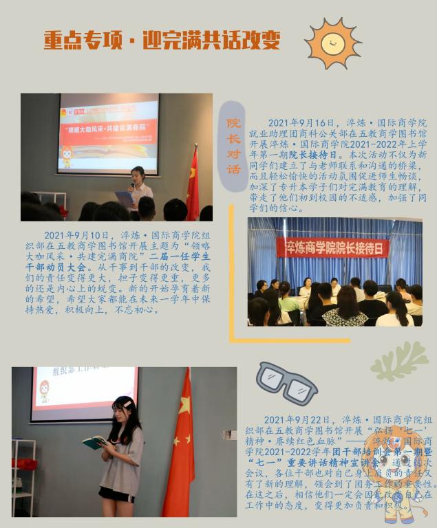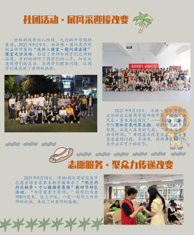 改变,是大一新生进入新校园的一种适应和体验;改变,是老生进入新学年的一种转换和调整;改变,是学生组织骨干们进入新岗位的选择和磨合;改变,是新学年学习目标的思考;改变,是新学年工作举措的创新。