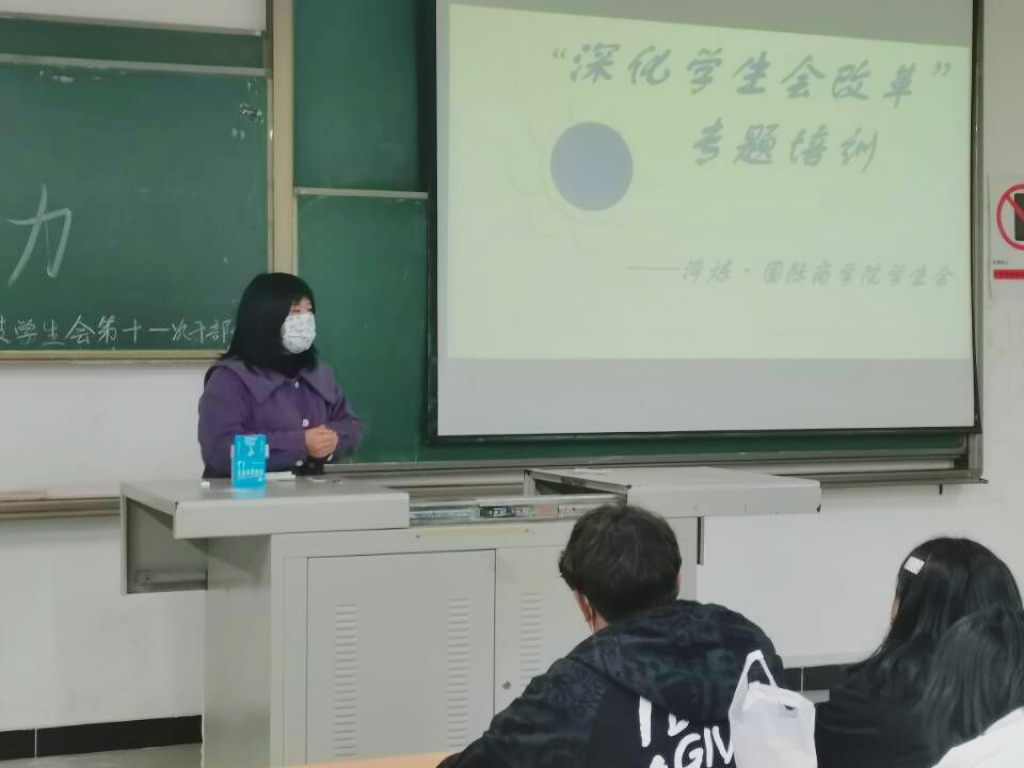10月20日,淬炼·国际商学院学生会执行主席张怡在五教一楼学生干部例会上开展了深化学生会改革专题培训,此次培训以习近平新时代中国特色社会主义思想为指导,以加强对同学的政治引领为根本,全心全意为同学服务,切实贯穿学生会改革,使其深入人心,深入讲解我为同学办件事系列活动要求,显著提升学生会工作人员引领和服务广大同学的水平和能力。