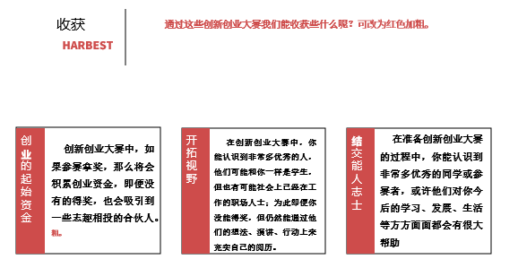 接着,班长为同学们介绍了多种创业大赛。他说参加创新创业大赛是创业之路的一条捷径,这是一个非常好的渠道,不过他也说到,参加比赛很容易,得奖却没那么容易。他说,参加比赛如果得奖,那么可以积累创业资金,如果没有得奖,也可以开拓同学们的视野,因此,他也非常鼓励大家多参加创新创业比赛。他还提到,在准备创新创业比赛的过程中,可以认识到更多优秀的同学,或许他们对你今后的学习、发展、生活等方面都会有很大的帮助。