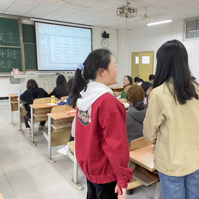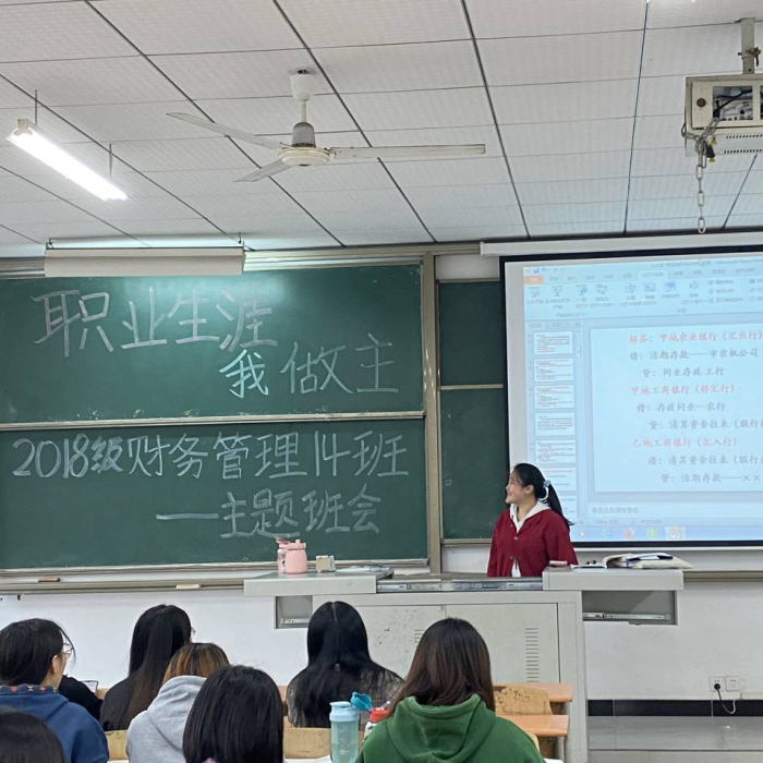 班长宋艾星同学用生动的语言、鲜明的事例,围绕中国财务管理专业的成就及面临的发展机遇、当前财管人才队伍的现状、财管类大学生的就业去向和大学生事业成功的基本点等问题进行了深入讲解,并切合实际提出了一些建议,强调毕业生在踏上工作岗位之后,需要怀有一种虚心的学习态度,对待工作要塌实肯干、执着追求。