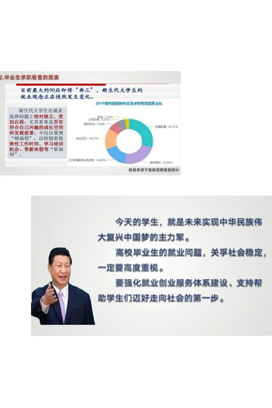 班长在网上找了2021届毕业生的大致就业情况,2018年7月中央政治局会议提出“六稳”,就业是六稳之首,2019年全国两会《政府工作报告》中提到双管齐下稳定和扩大就业,扎实做好毕业生、农民工、退役军人等群体就业,是新时期就业工作的新变化、新要求,并对强化就业政策要求和纪律要求进行政策解读。引导学生了解就业政策,拓宽就业领域,实现多渠道就业,引导毕业生到基层就业、中小微企业、新兴行业就业,鼓励学生参军入伍。