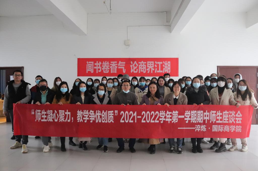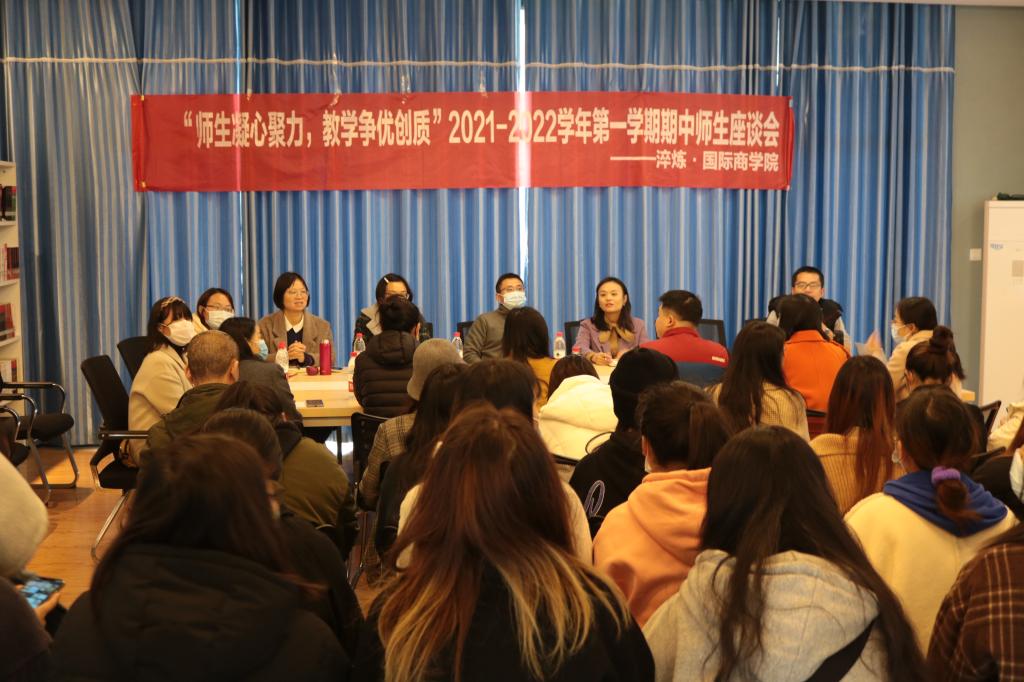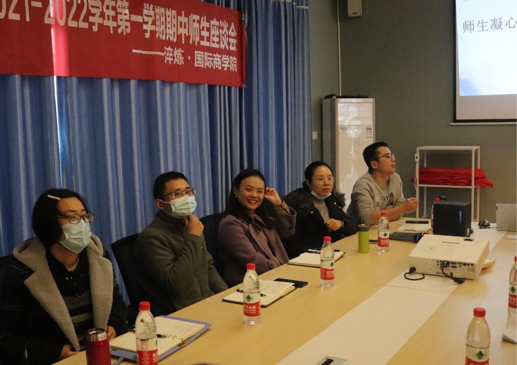 为全面了解和掌握学院整体教学运行情况,及时发现和解决教学中存在的问题,进一步规范教学行为,强化教学管理,优化教学质量,营造乐学、乐教的商院学习氛围。淬炼•国际商学院于2021年11月11日14:30在五教五楼图书馆召开2021-2022学年第一学期期中教学检查学生座谈会。出席本次共活动的老师有淬炼·国际商学院院长张平、副院长曾璐、副院长陈晓曼、副院长刘薇唯、学生处潘颖老师、各教研室主任、全体辅导员老师以及24位学生代表。