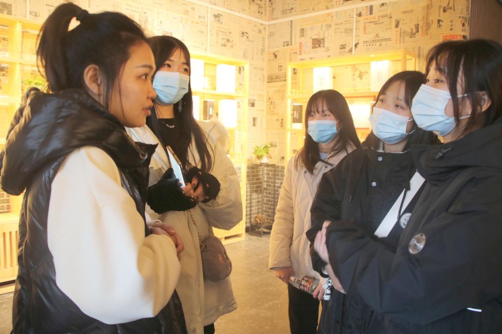 新开始,新征程。本期走访百商在李晓燕老师的带领下同学们来到了位于合川文峰古街的“净果缘”企业。作为企业负责人和非物质文化遗产继承人的刘颖“小姐姐”向同学们热情地介绍了合川非物质文化遗产——枇杷酒。在提到作为非物质文化遗产继承人是否舍弃过自己所热衷的事物时,她说到,现在从事的一切都是自己热爱的,而做自己热衷的事情是很幸福的,并希望同学们在以后的职场生涯中能够从事自己钟爱的事业。正所谓,干一行,爱一行,爱一行,精一行。回忆心路历程,她感慨到虽然过程很艰辛,但也是有所收获的,阶段性的成果都是对自己的肯定与鼓励,学会有耐心做好每一件小事,积少成多,困难的事情也就迎刃而解了。