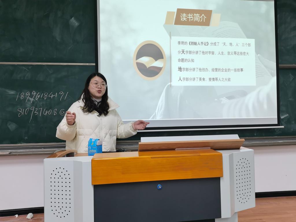 接着黄新燕老师向同学们分享了自己阅读大咖书籍的感受。黄新燕老师分享的是季琦的《创始人手记》一书,该书分成了“天、地、人”三个部分。季琦的与众不同在于他多了一些文人气质,多了一些感性,在这个碎片化的时代,要精选值得我们花时间的事情和人,将这些事情做到极致,对我们爱的人付出最真的情感,给予这些人和事最多的时间和资源。教育让我们成为一个感性的人,能够感知周围的美好与幸福,而完满教育正是让我们在这样的感知里多了一些敢于展现的勇气和底气。