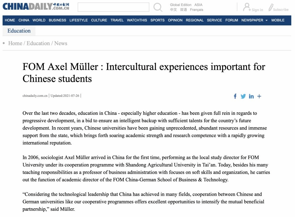 德国FOM大学为重庆移通学院国际商学院本硕连读的合作院校,其社会学家穆勒教授在接受中国日报采访时提出:指出跨文化教育在未来对中国学生将变得越来越重要。在过去的20年里,中国的教育,尤其是高等教育,得到了充分的发展,以确保为国家的未来发展提供足够的人才储备。近年来,中国的大学从国家获得了前所未有的丰富资源和巨大支持,这带来了中国学术实力和研究能力的飙升,国际声誉迅速提高。