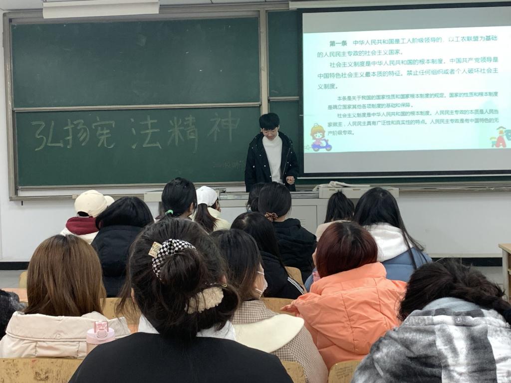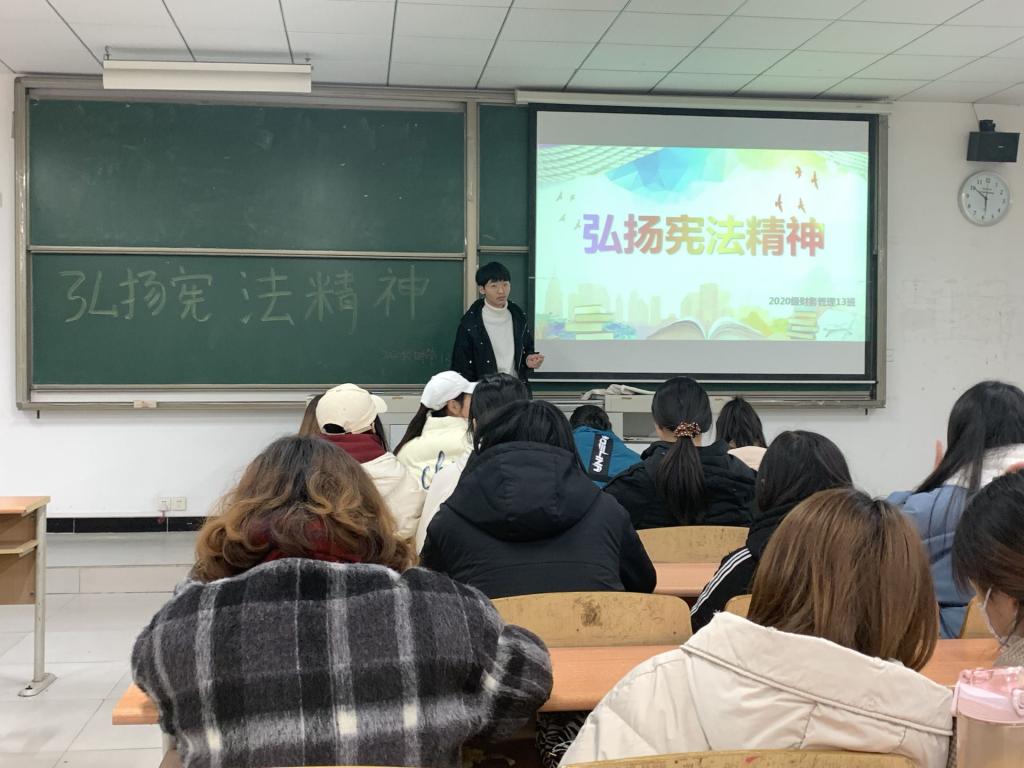 为了更深入了解宪法精神,使宪法教育深入校园,推动创新、协调、绿色、开放、共享发展,培育法治观念的校园氛围。淬炼·国际商学院2020级财务管理13团支部于12月7日下午18:00在第五教学楼401室召开“弘扬宪法精神”主题团日活动。