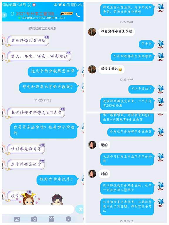 通过前期的小组座谈交流,发现有部分学生准备考研。秉承因材施教的原则,陈明燕老师与学生进行了一对一沟通,开展个性化辅导。通过线上、线下交流的方式,陈明燕老师对有考研意向的学生从如何选择地区、如何选择院校、如何选择专业、如何复习等方面进行了辅导交流,并对学生的状态进行持续追踪,了解学生当前状态。
