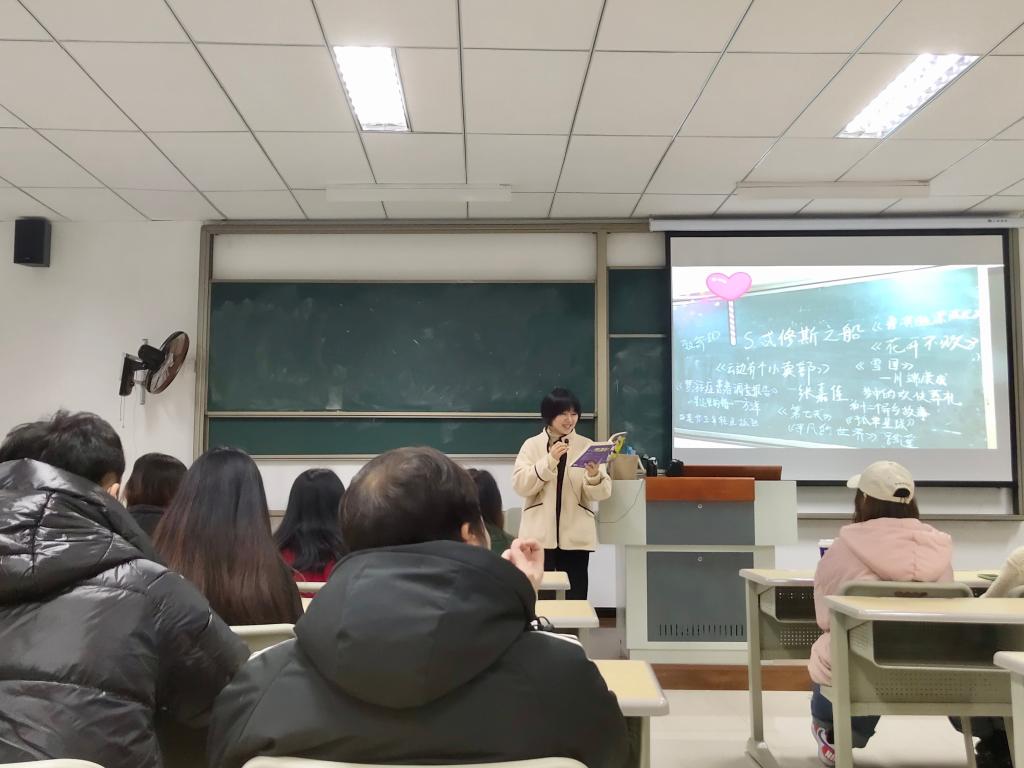 窦雯婷同学向大家推荐了毛姆的《月亮和六便士》,鼓励大家不要忘记自己的理想和追求,也与大家分享了读蒋勋的《孤独六讲》的感受,告诉大家在遇到困境的时候要理解自己、调节自己。