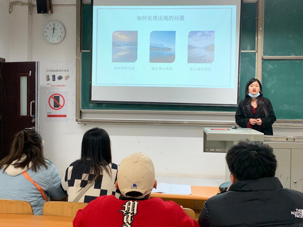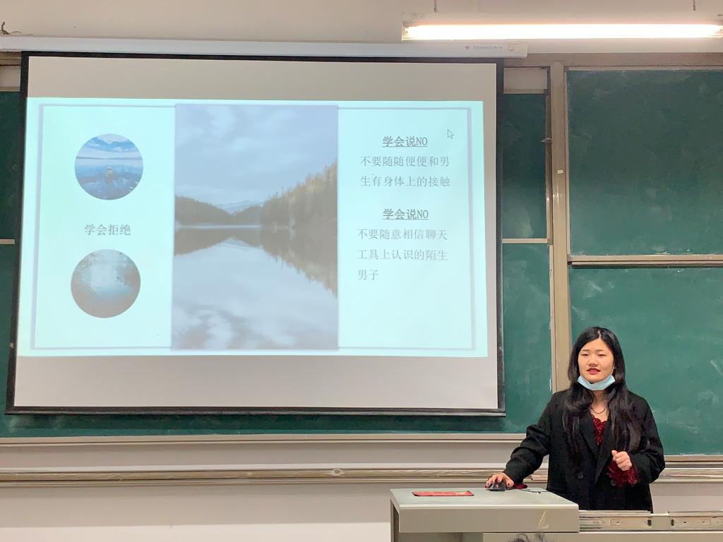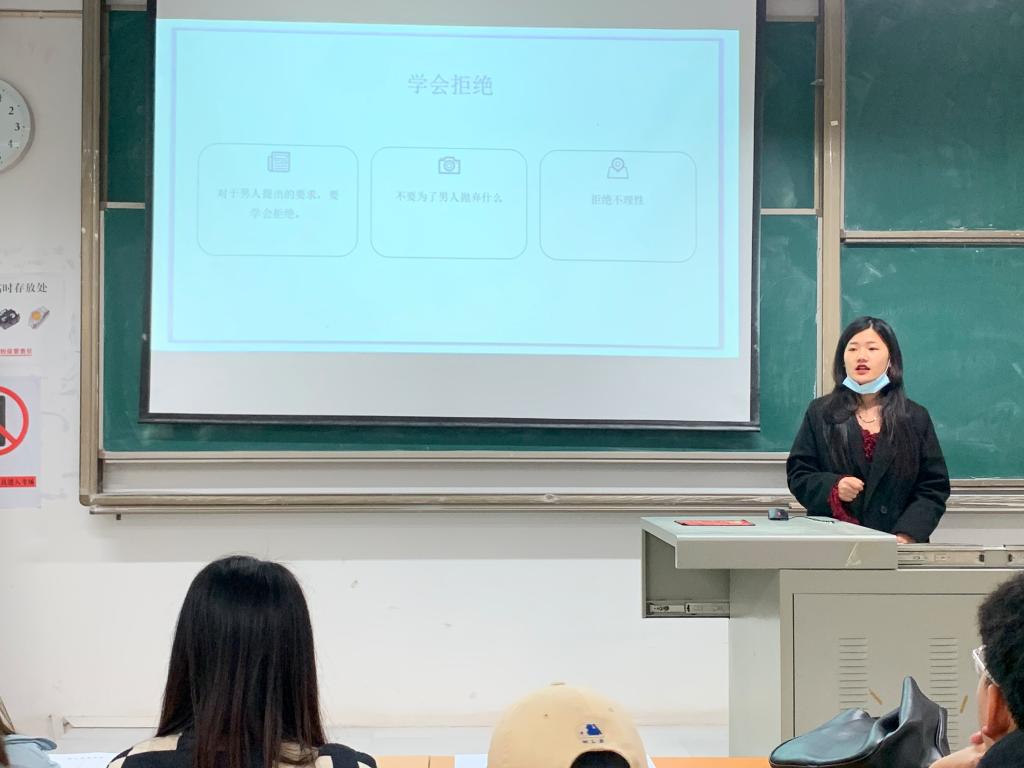 张彬同学上台讲述了小组成员对于在恋爱中我们应该如何保护自己这方面问题的思考,首先我们应时刻保持理智,不能被一时的新鲜感或受一时的荷尔蒙迷惑就失去理智。